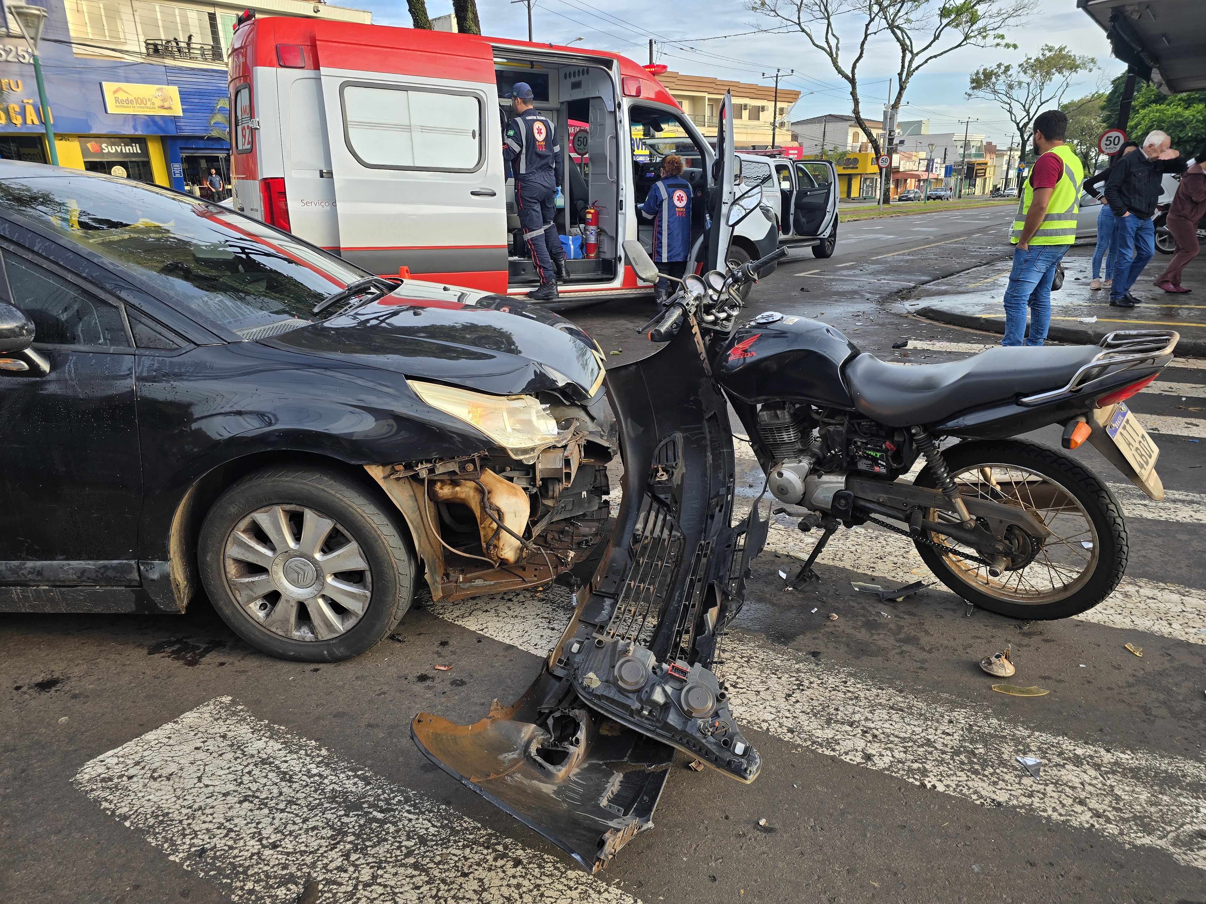 O acidente aconteceu na manhã desta sexta-feira, 6, no cruzamento da Avenida Mandacaru com Rua Duartina, em Maringá. Uma mulher que dirigia um Citroen C4 cruzou a preferencial de uma motociclista que seguia pela Mandacaru sentido centro/bairro.