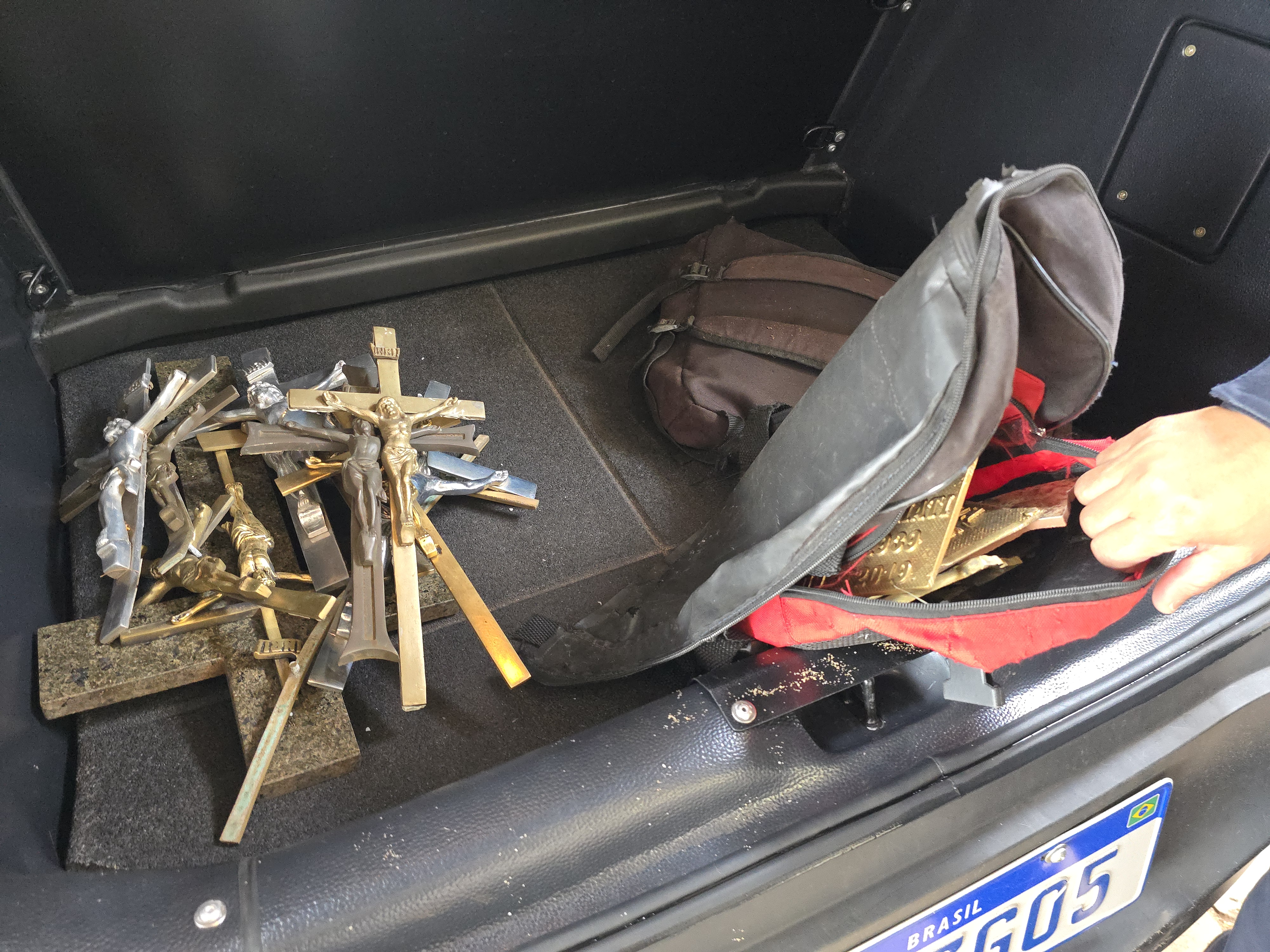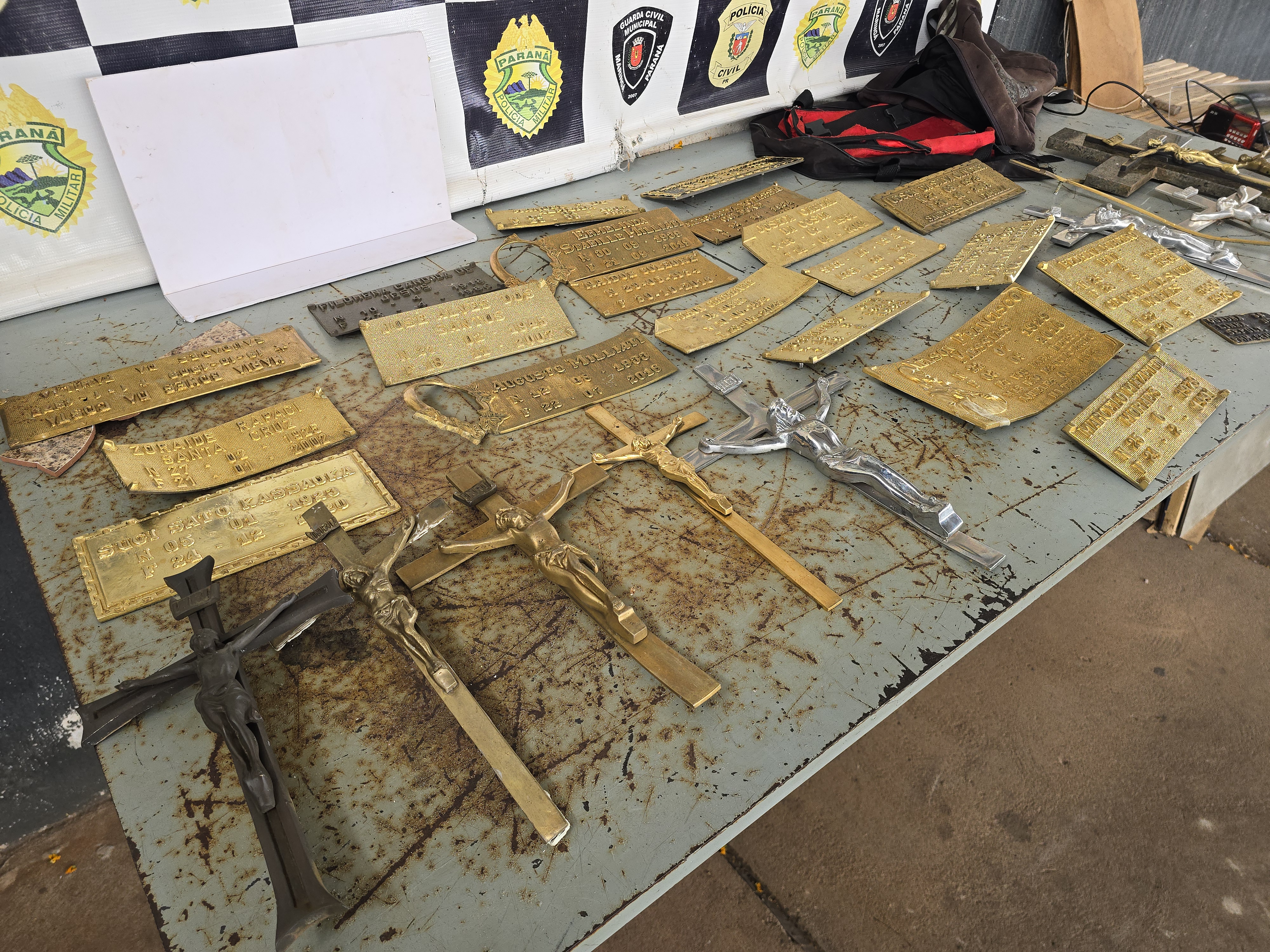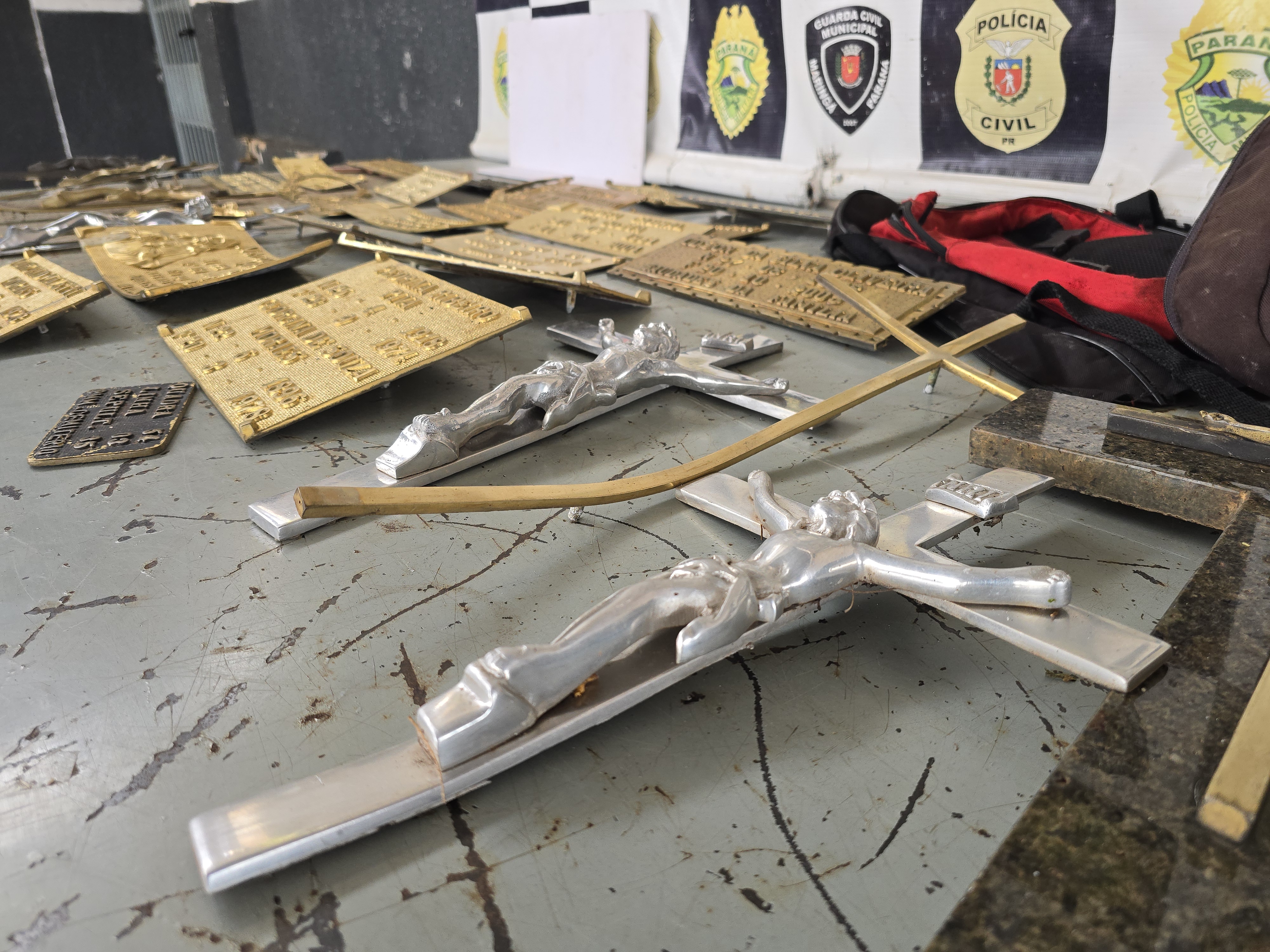 Duas mochilas lotadas de peças de bronze foram localizadas abandonadas dentro de um túmulo no Cemitério Municipal de Maringá. Os ladrões arrancaram os objetos dos túmulos e deixaram na sepultura para retornar e buscar horas depois.