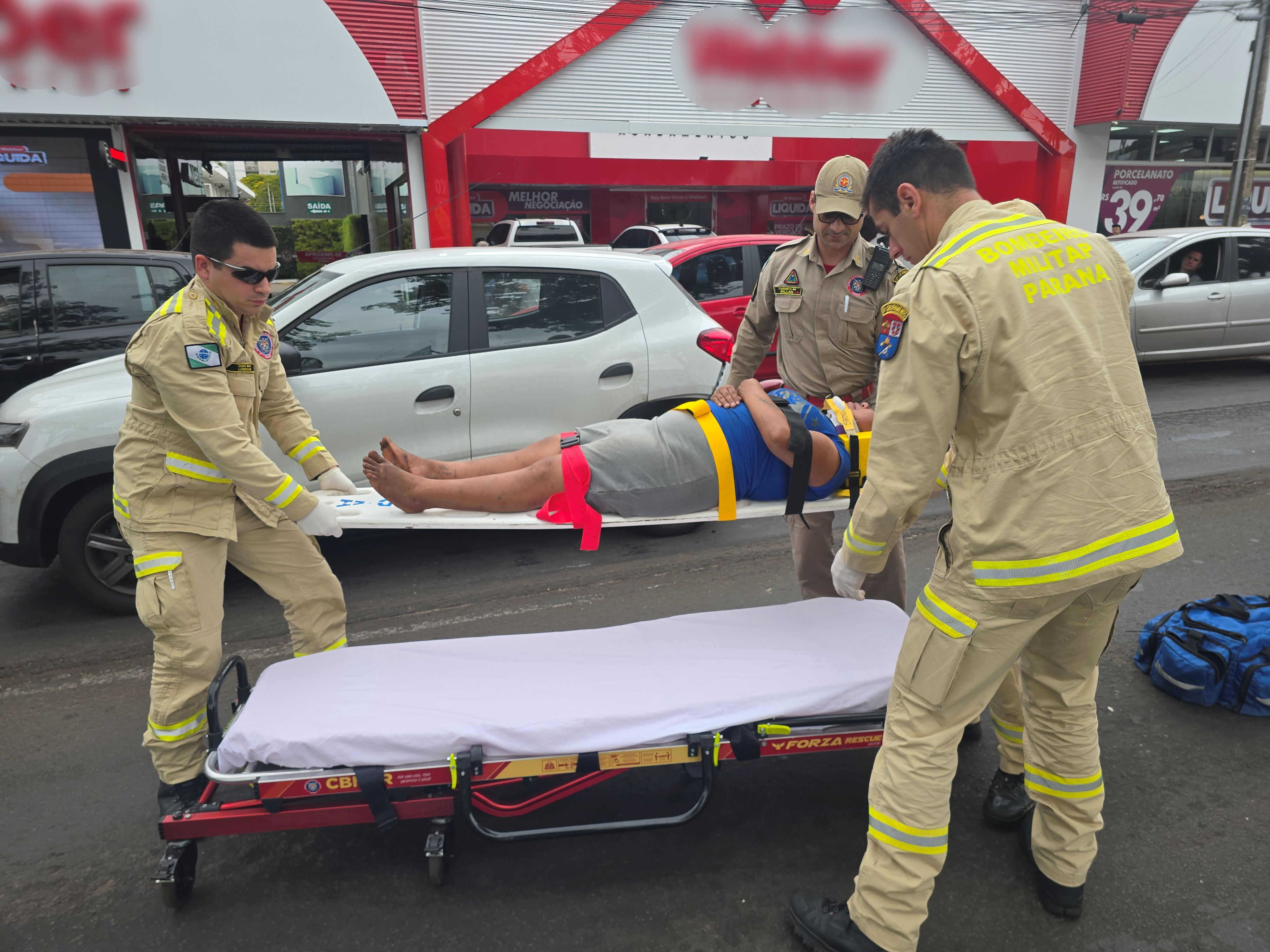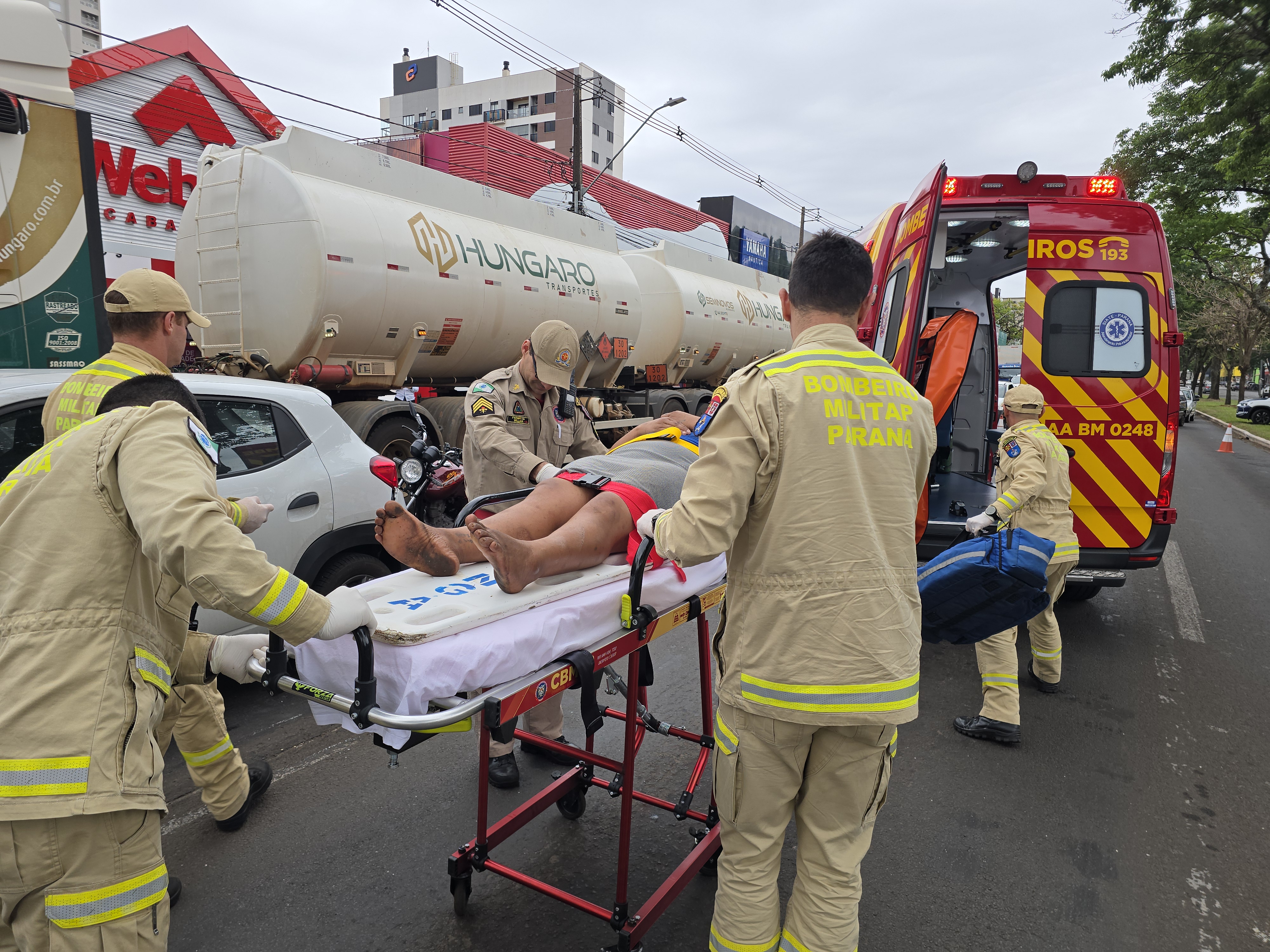 Uma equipe da Guarda Municipal que passava pelo local prestou os primeiros atendimentos até a chegada do Corpo de Bombeiros. A mulher sofreu escoriações sendo encaminhada ao hospital para uma melhor avaliação. O motociclista recusou atendimento.