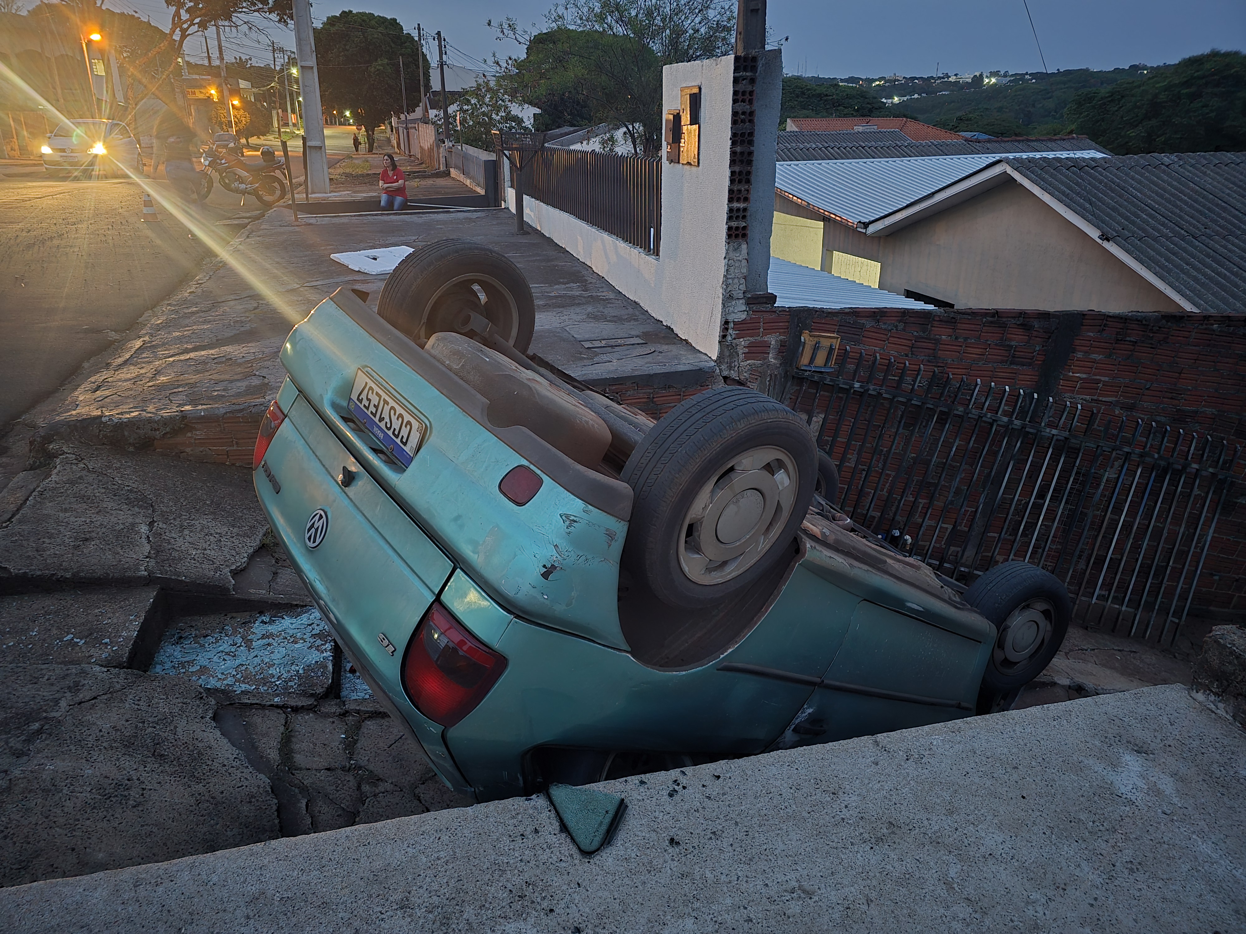 O acidente aconteceu no final da tarde de quinta-feira, 23, na Rua Pioneiro João Pinheiro Dantas, no Parque Itaipu, em Maringá. Uma mulher que transportada dois filhos sofreu um capotamento quando descia pela Rua Piapara.