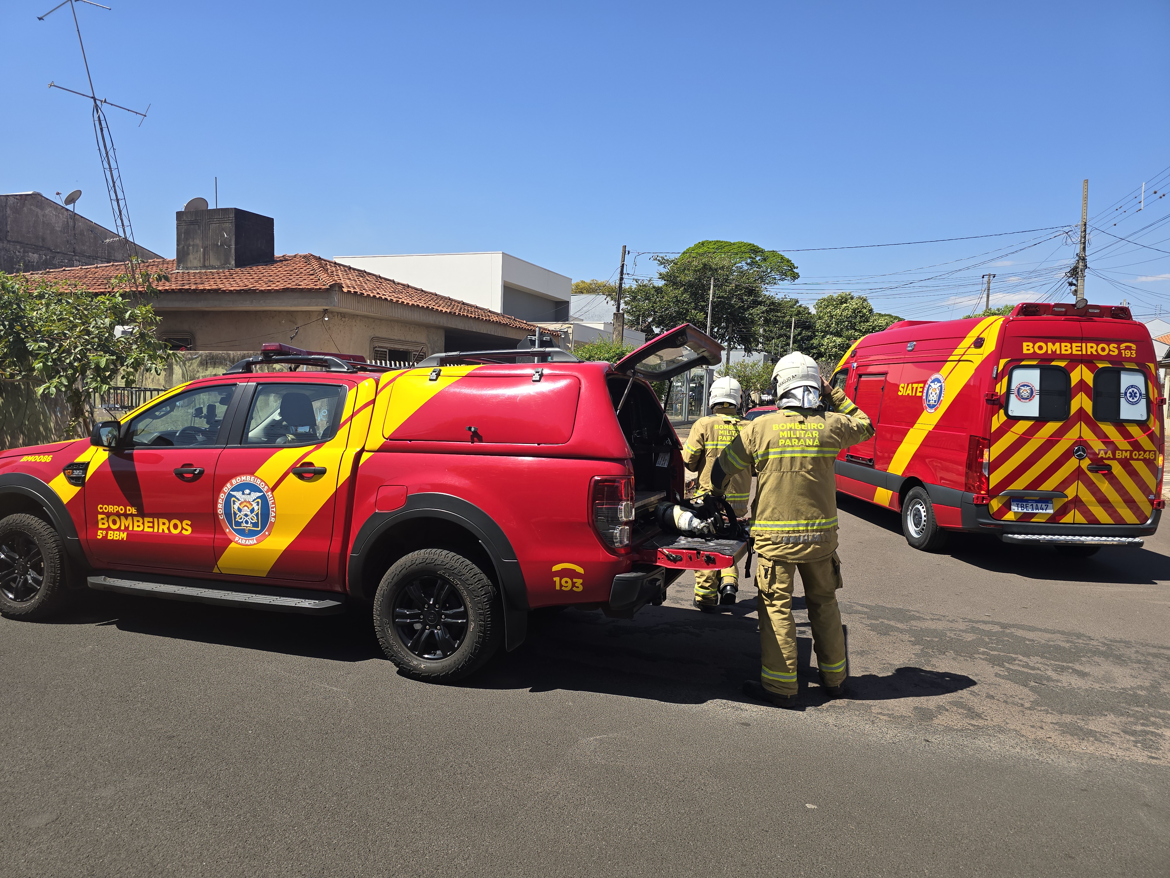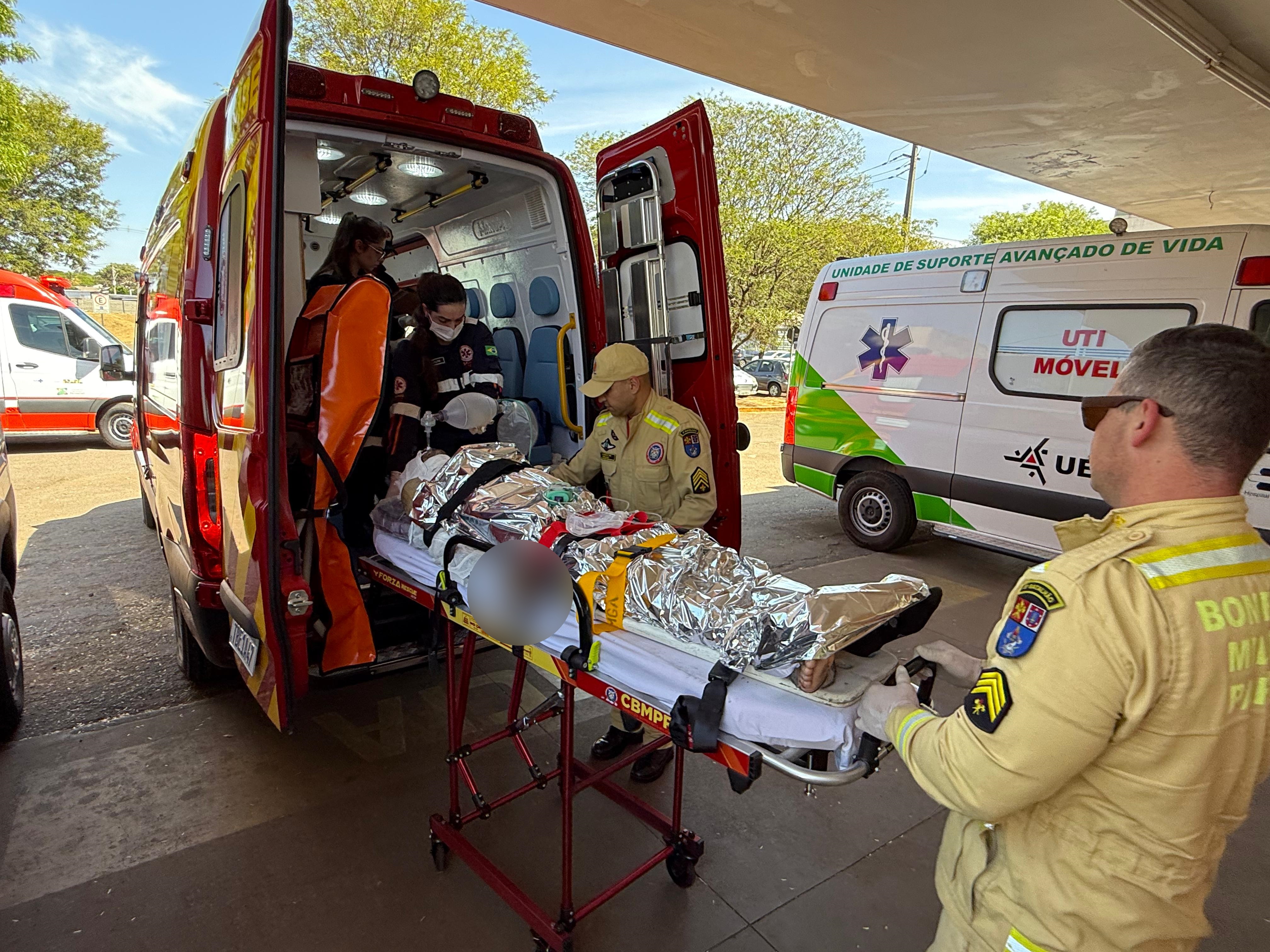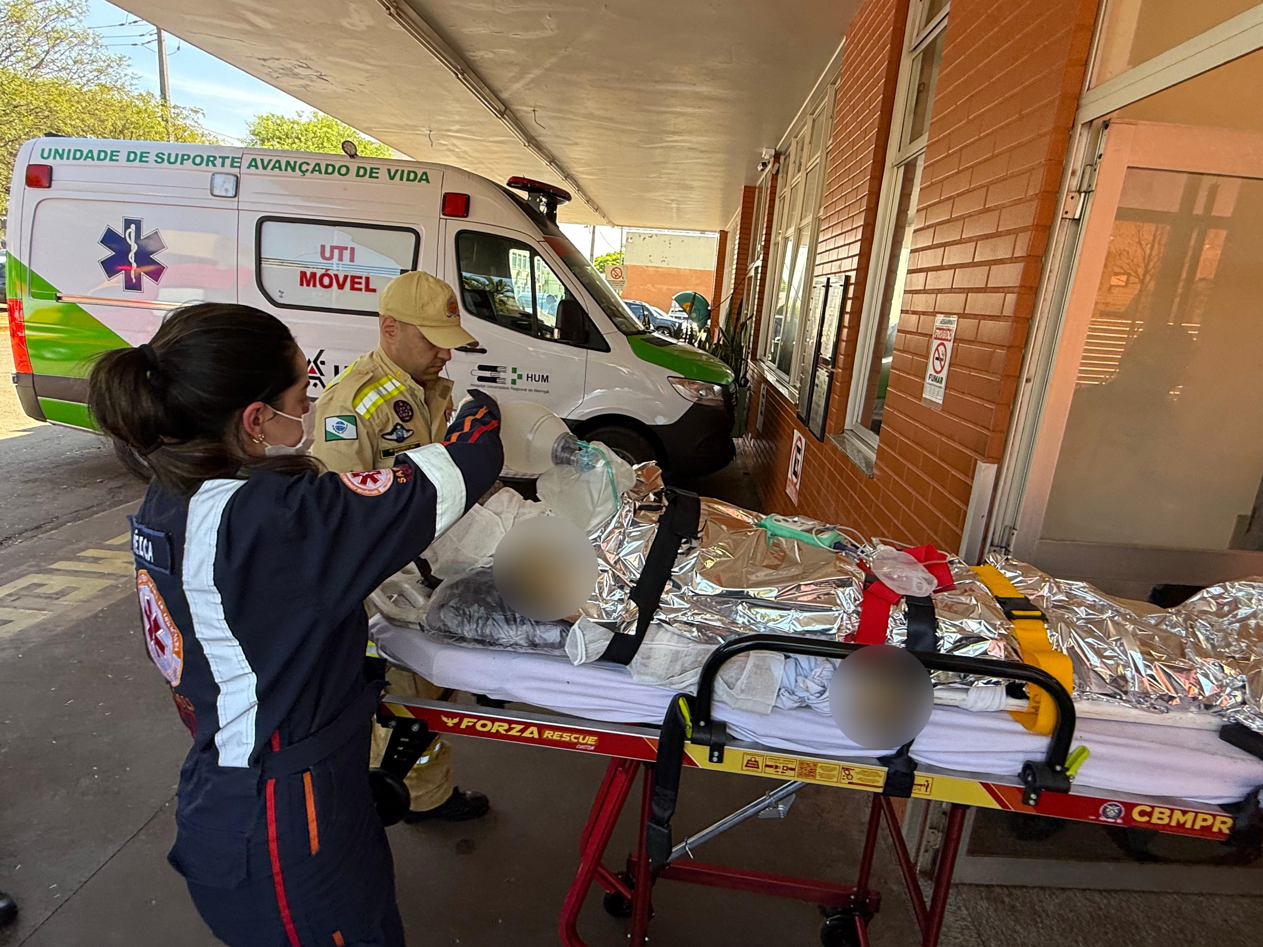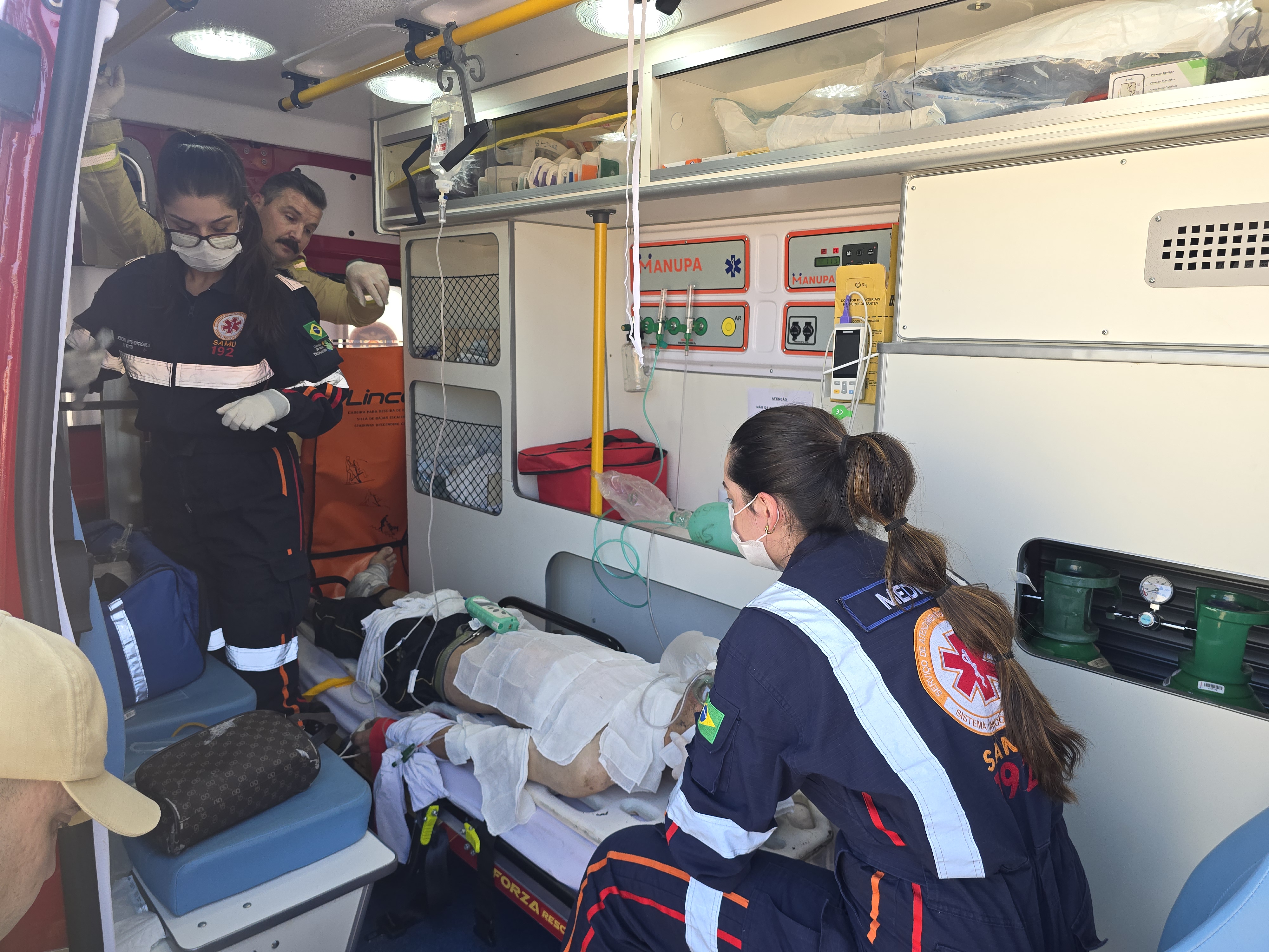 Enquanto alguns bombeiros apagavam o fogo na residência, outros prestavam atendimento ao rapaz. Uma equipe médica do Samu foi solicitada pelo Corpo de Bombeiros. Ao avaliar as condições da vítima, uma médica intubou o homem que já apresentava baixo nível de consciência.