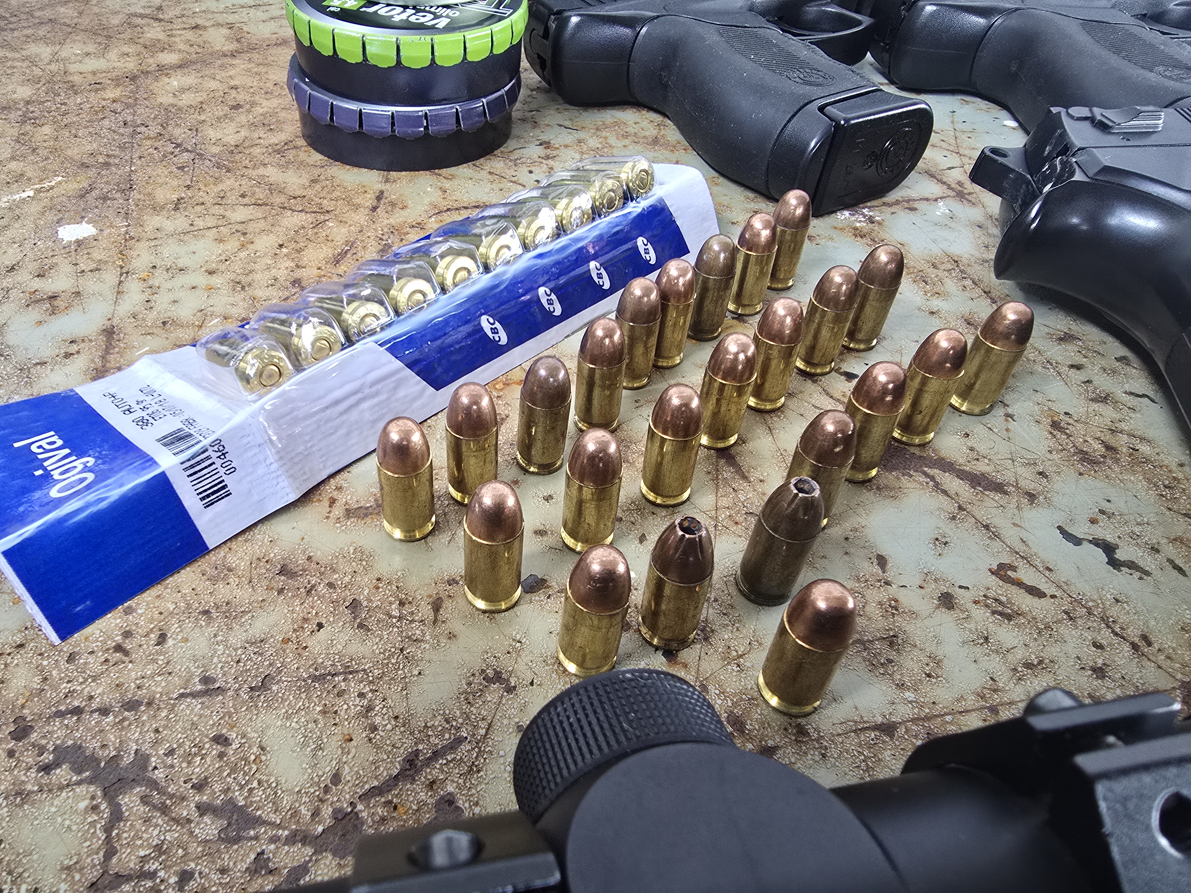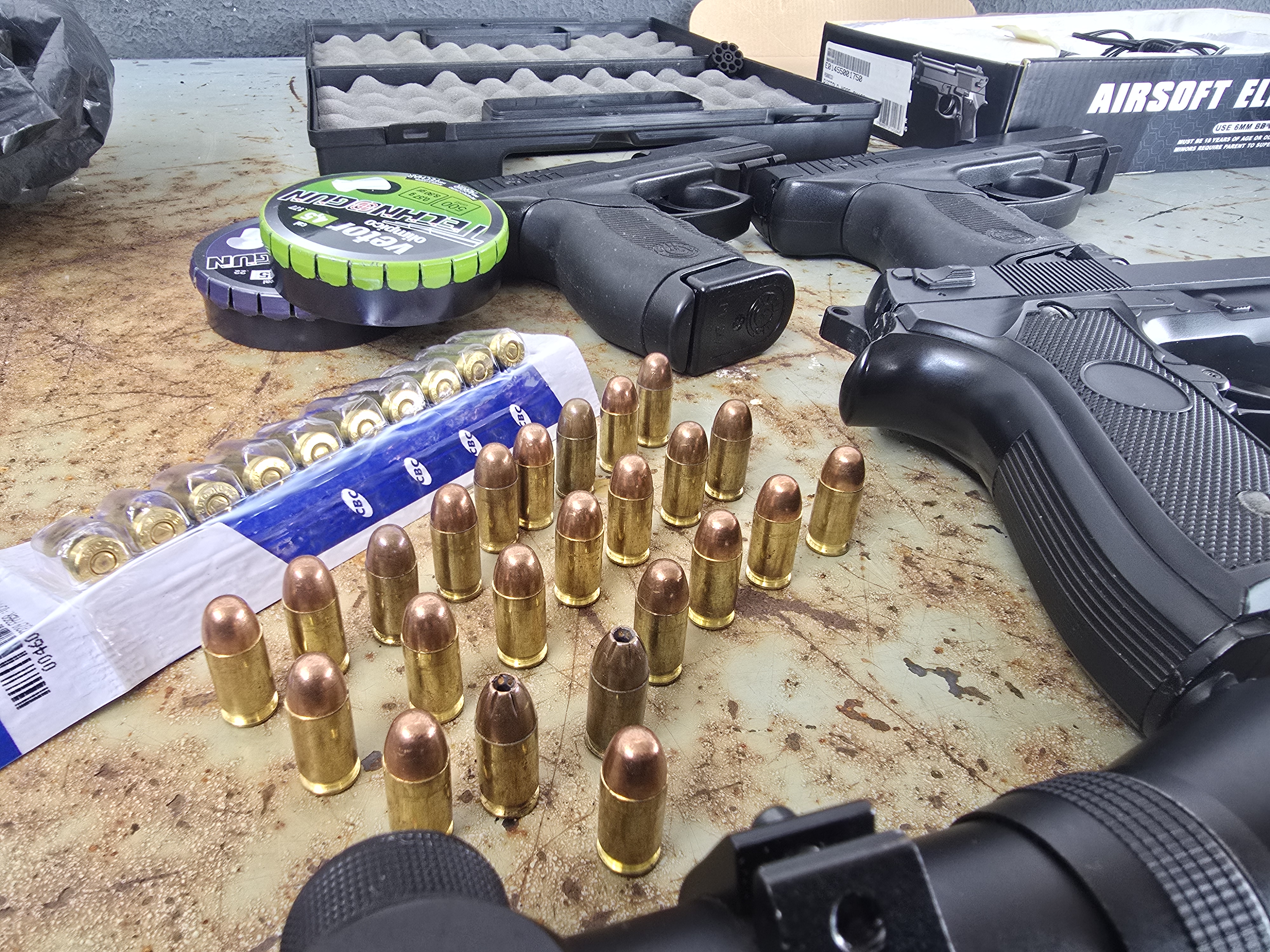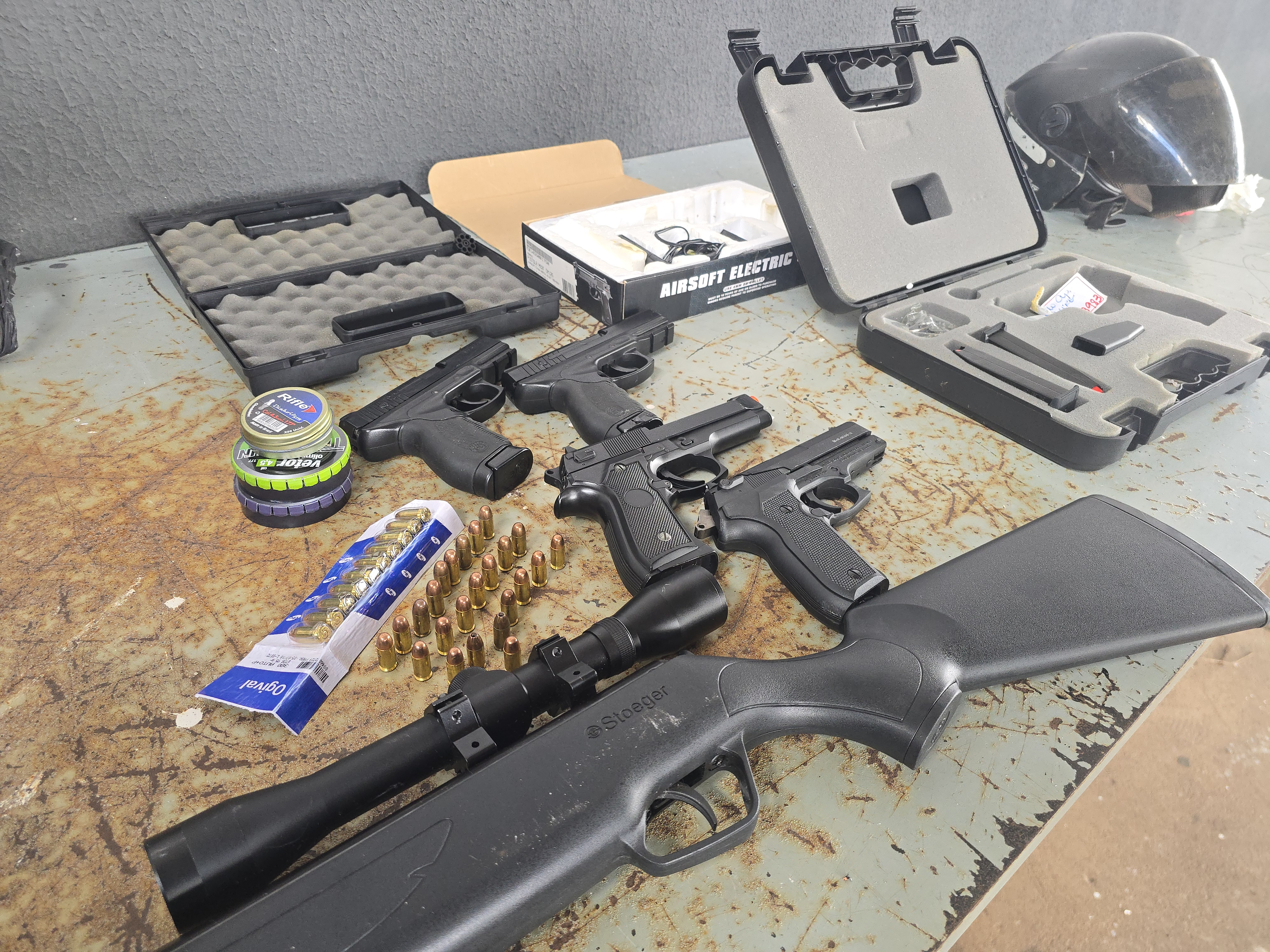 Outras equipes policiais deslocaram até a residência do outro envolvido e lá conseguiram localizar armamento escondido na casa. Foram apreendidas quatro pistolas de airsoft, dois carregadores de pistola letal que estavam dentro de uma maleta da marca Taurus, e ainda munições de calibre 9mm.