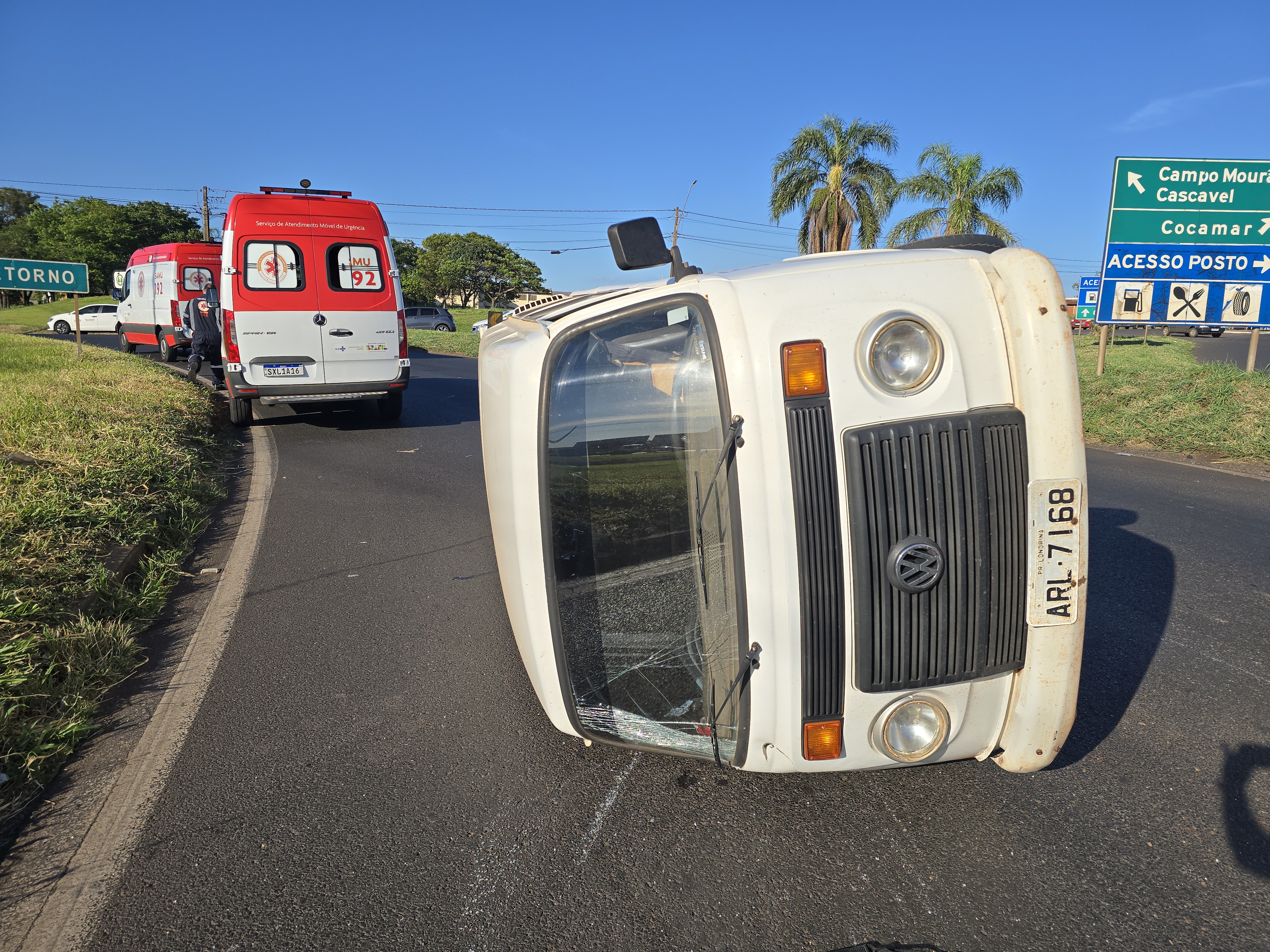 Uma VW Kombi tombou na manhã desta sexta-feira, 5, na rodovia PR-317, na saída para Campo Mourão. A utilitário transportava trabalhadores quando foi atingida por um automóvel Jeep Compass. O motorista da Kombi realizava a rotatória quando a condutora do carro invadiu a preferencial.
