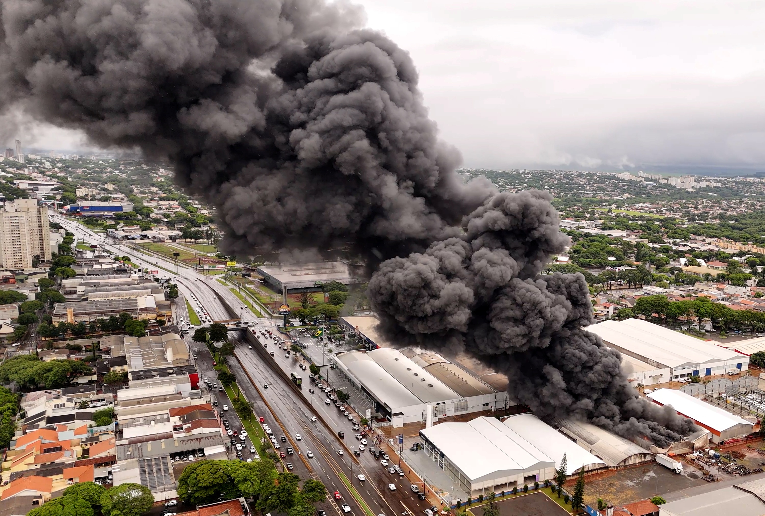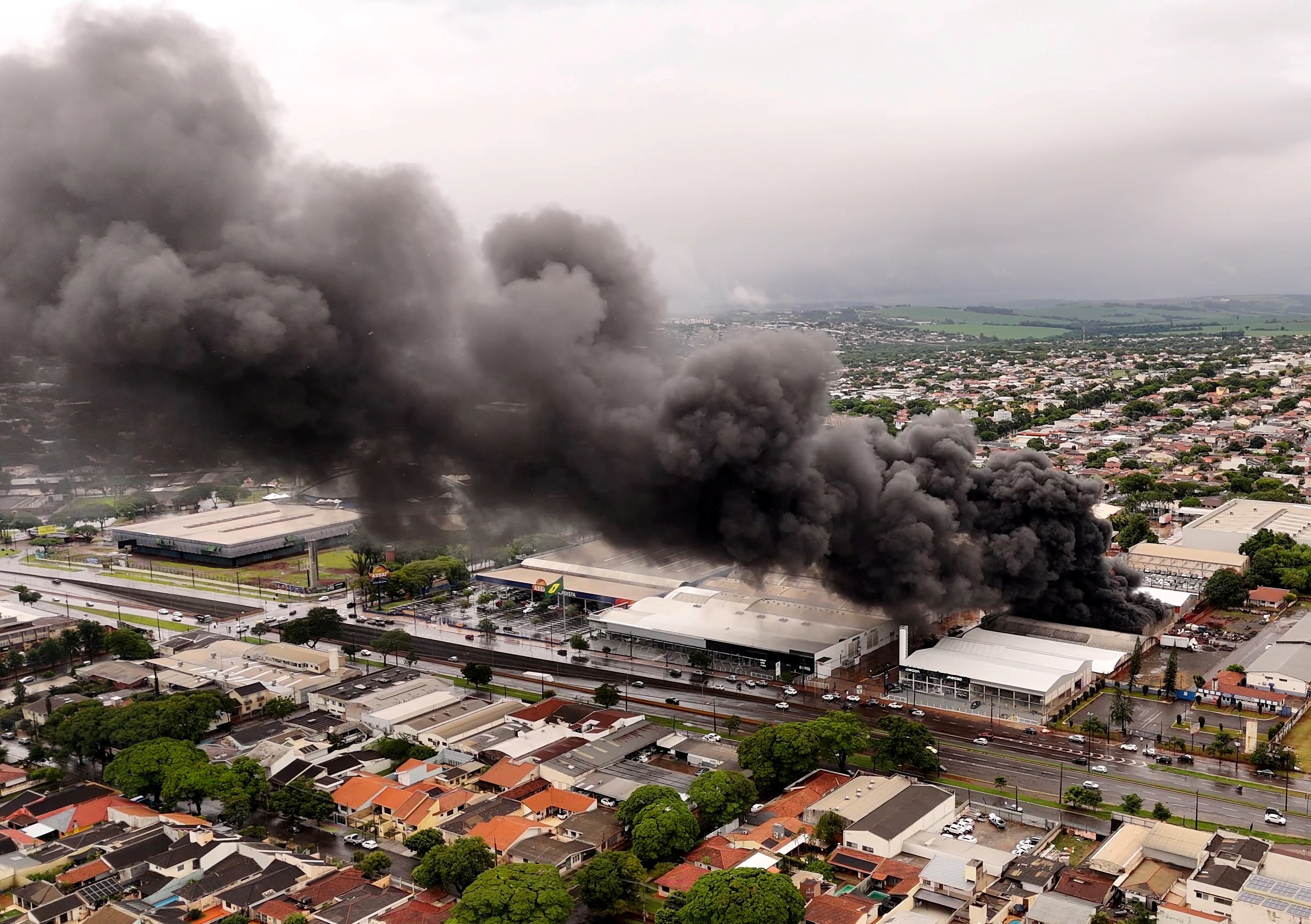 Um incêndio de grandes proporções atingiu um barracão na tarde deste domingo, 14, que fica localizado na Rua Rubens Sebastião Marin, na marginal da Avenida Colombo, em Maringá. O espaço armazenava peças de caminhão e carretas, incluindo papelão, madeira compensada, colas e embalagens.