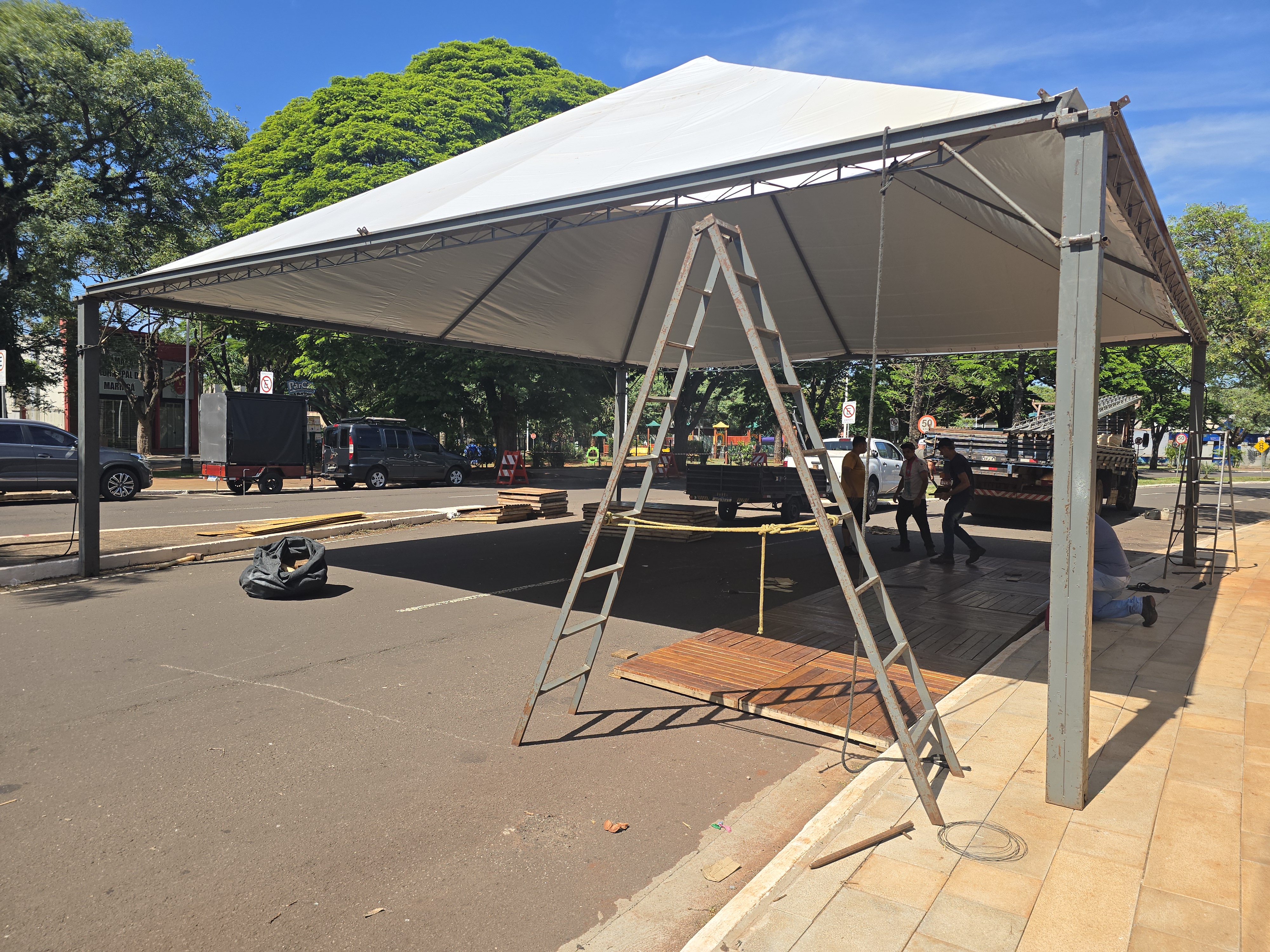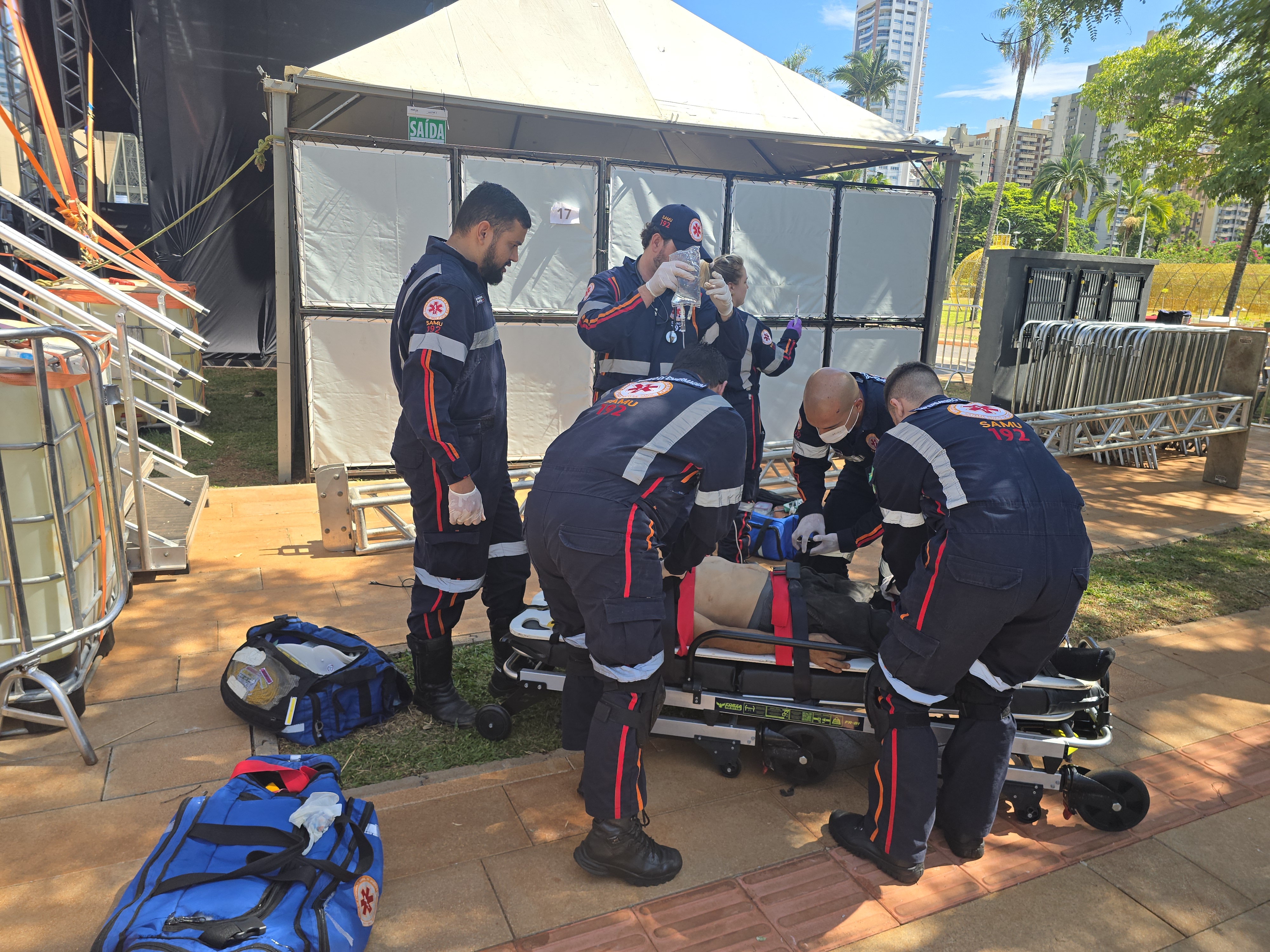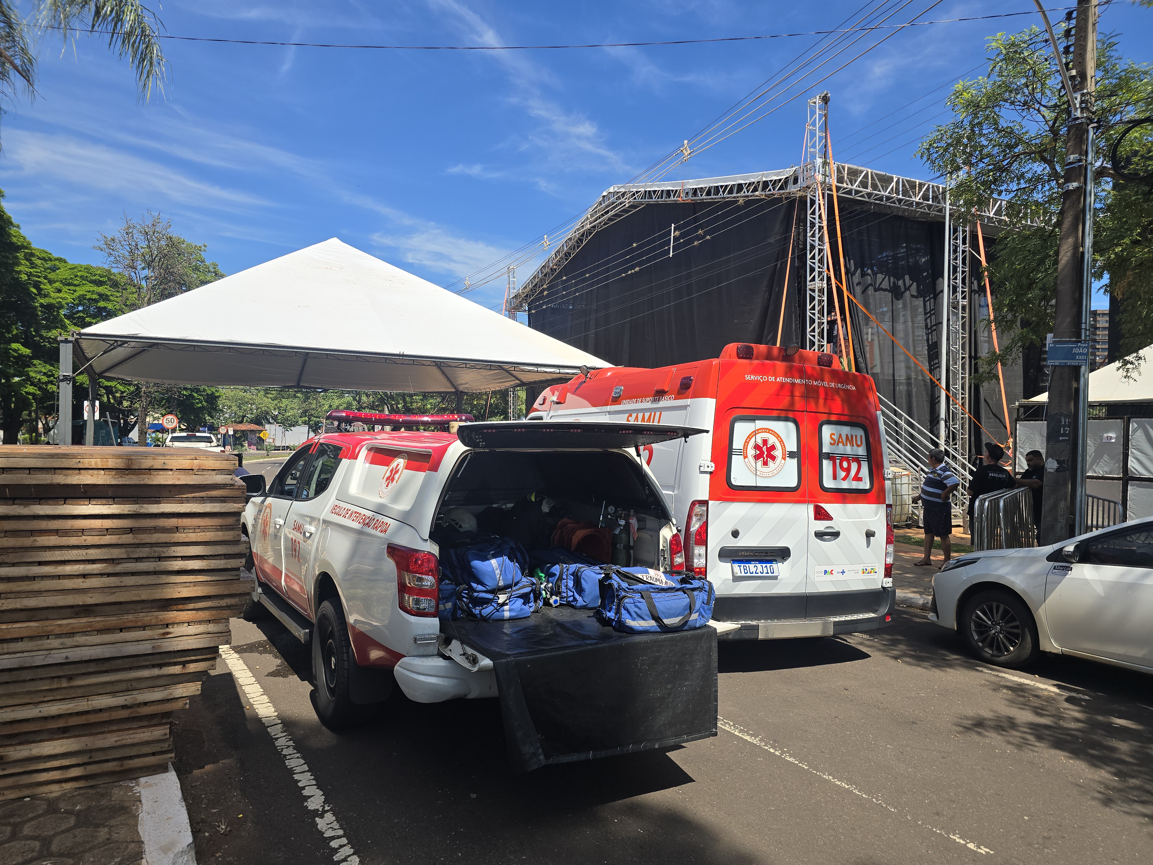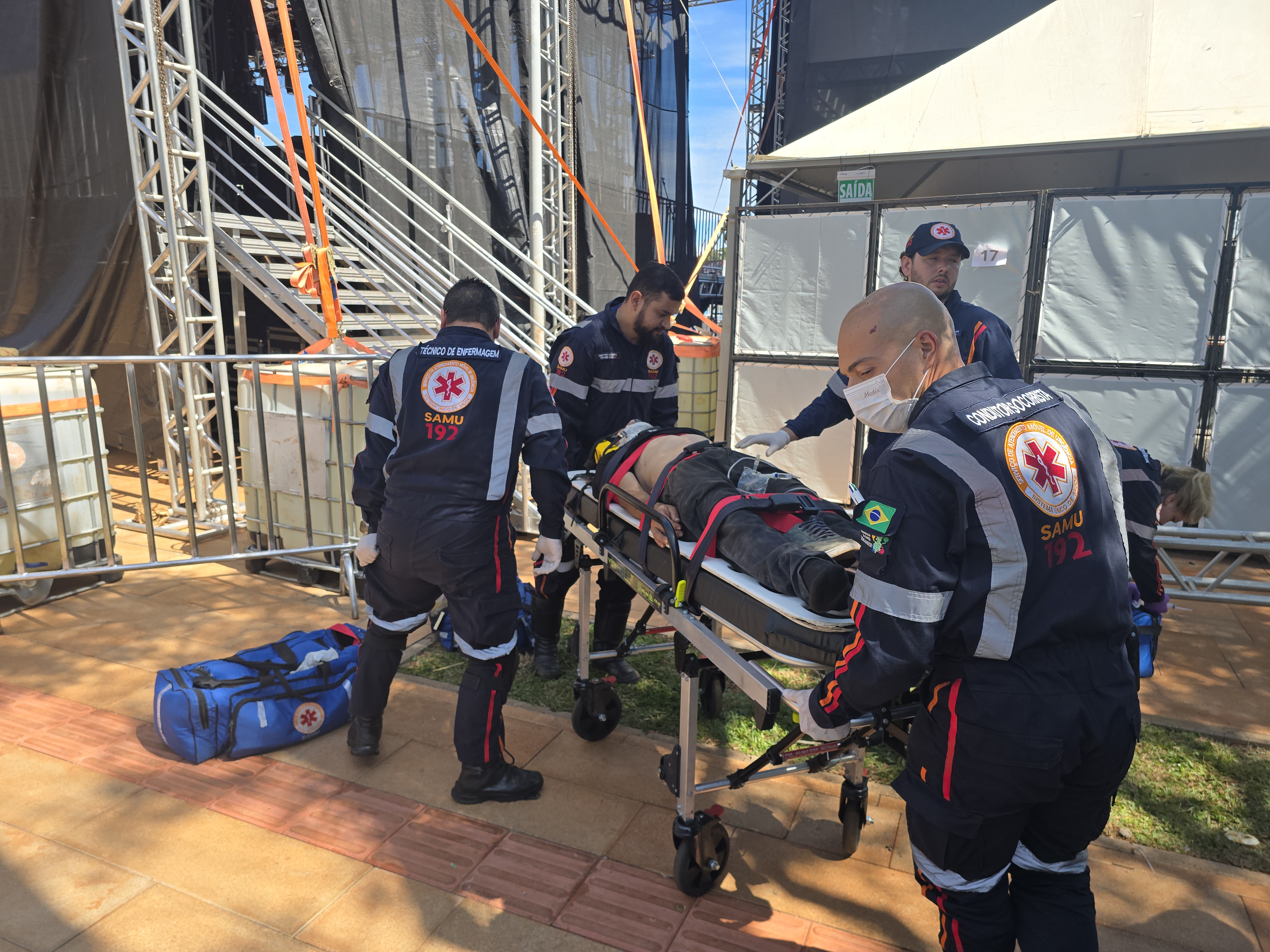 Um homem de 47 anos foi socorrido na manhã desta quarta-feira, 31, após sofrer uma queda de escada. A vítima estava realizando um trabalho na estrutura do show de uma dupla sertaneja que irá se apresentar na virada de ano na Praça da Catedral.