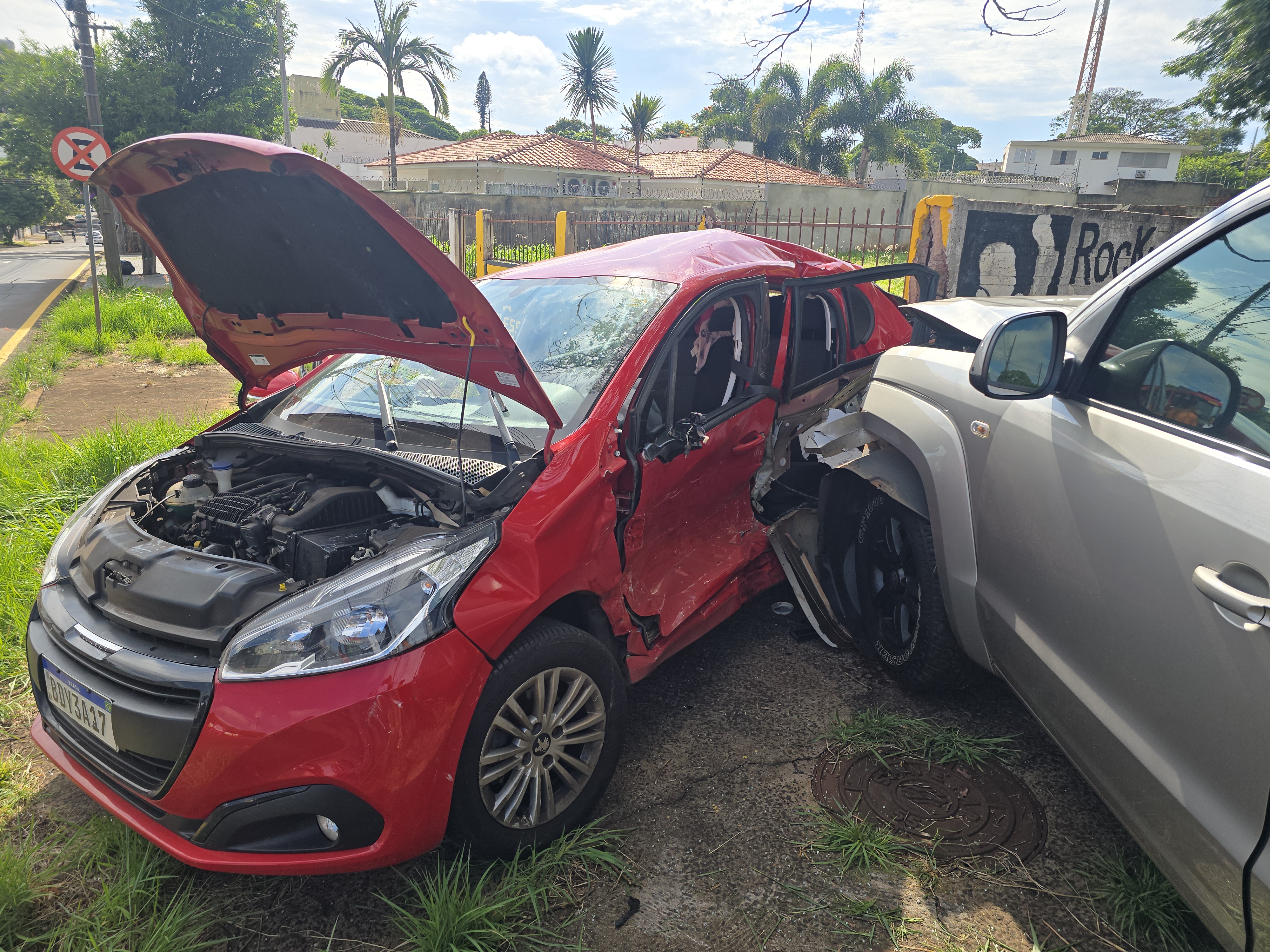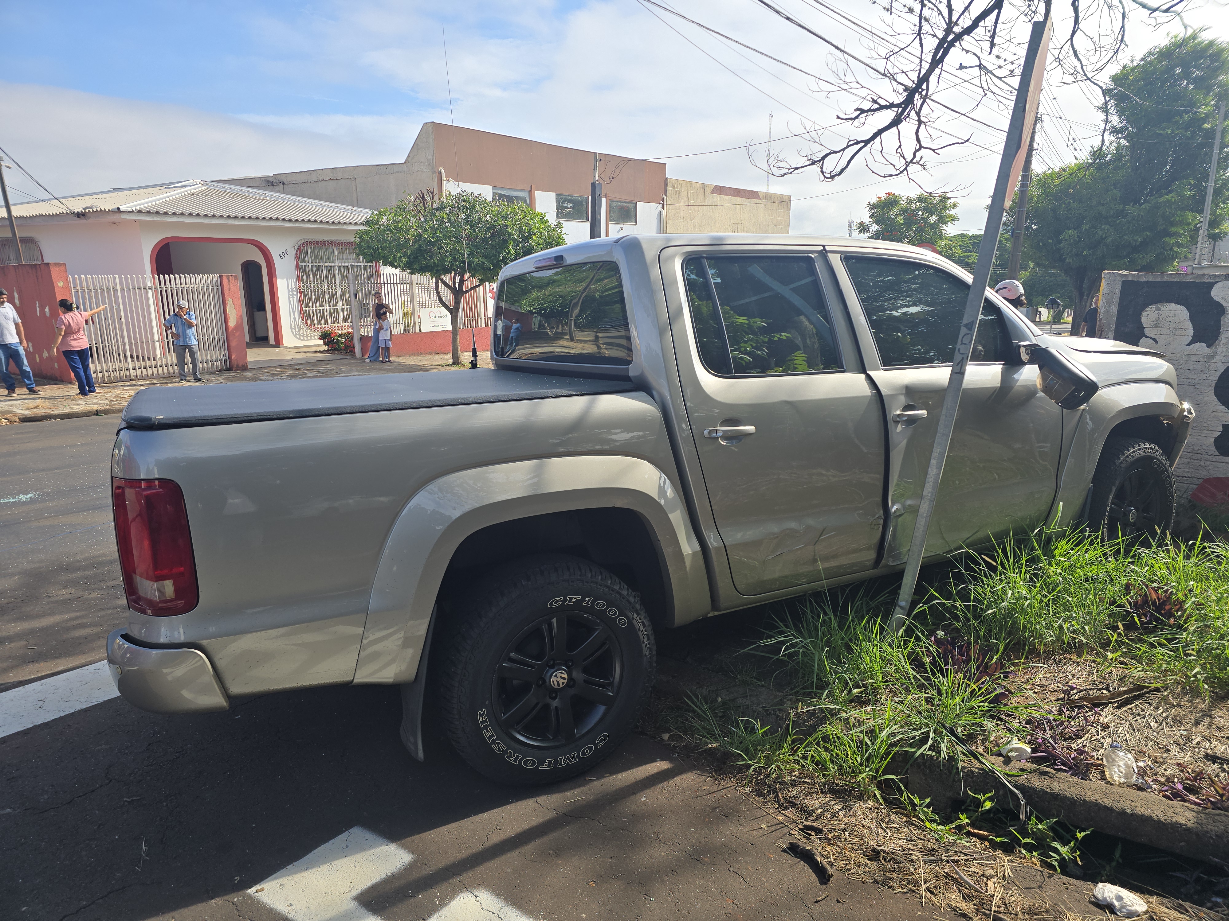 O acidente aconteceu no cruzamento da Rua Antônio Carniel com Emílio Mineiro, na zona 5, em Maringá. O motorista de uma caminhonete VW Amarok avançou a preferencial de um automóvel Peugeot Active. A colisão foi tão forte que os dois veículos rodaram e subiram na calçada.
