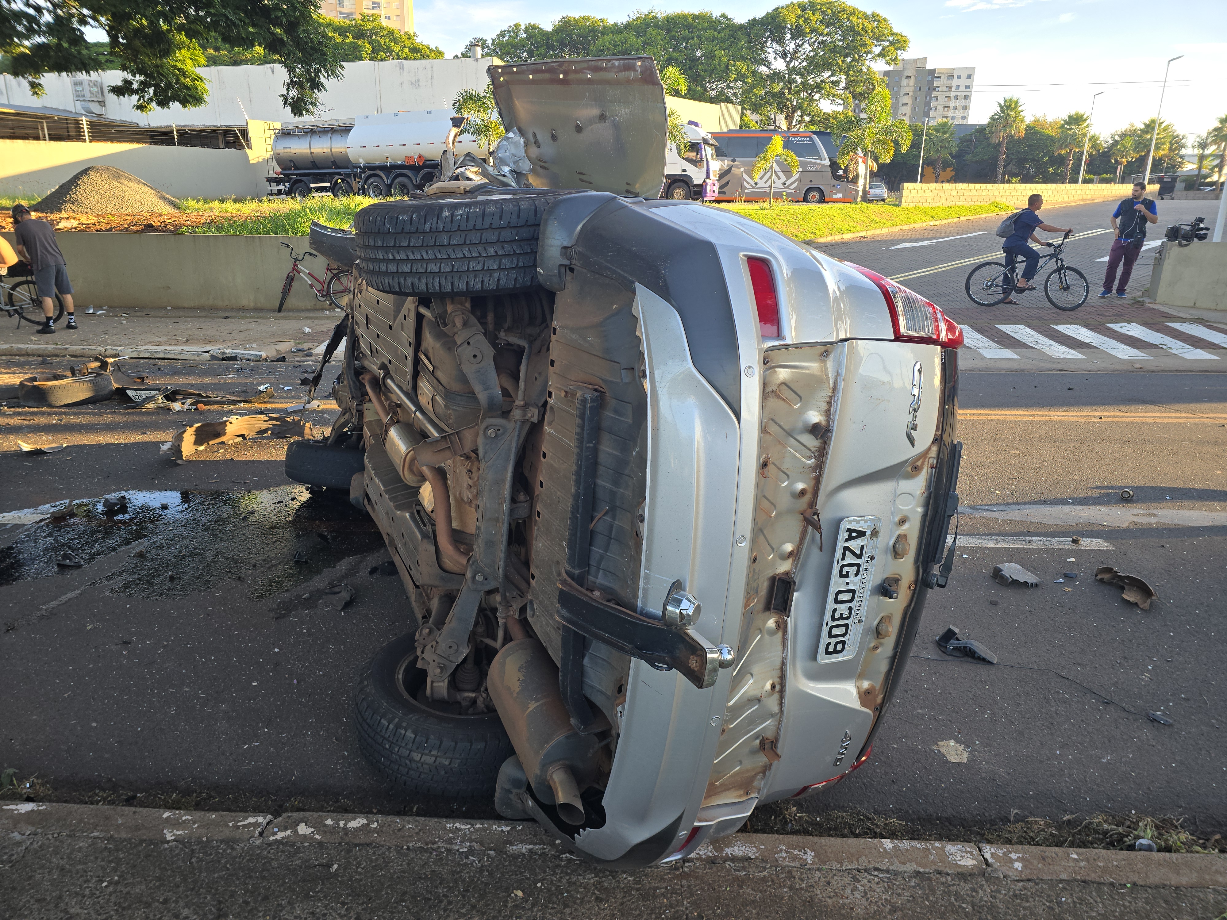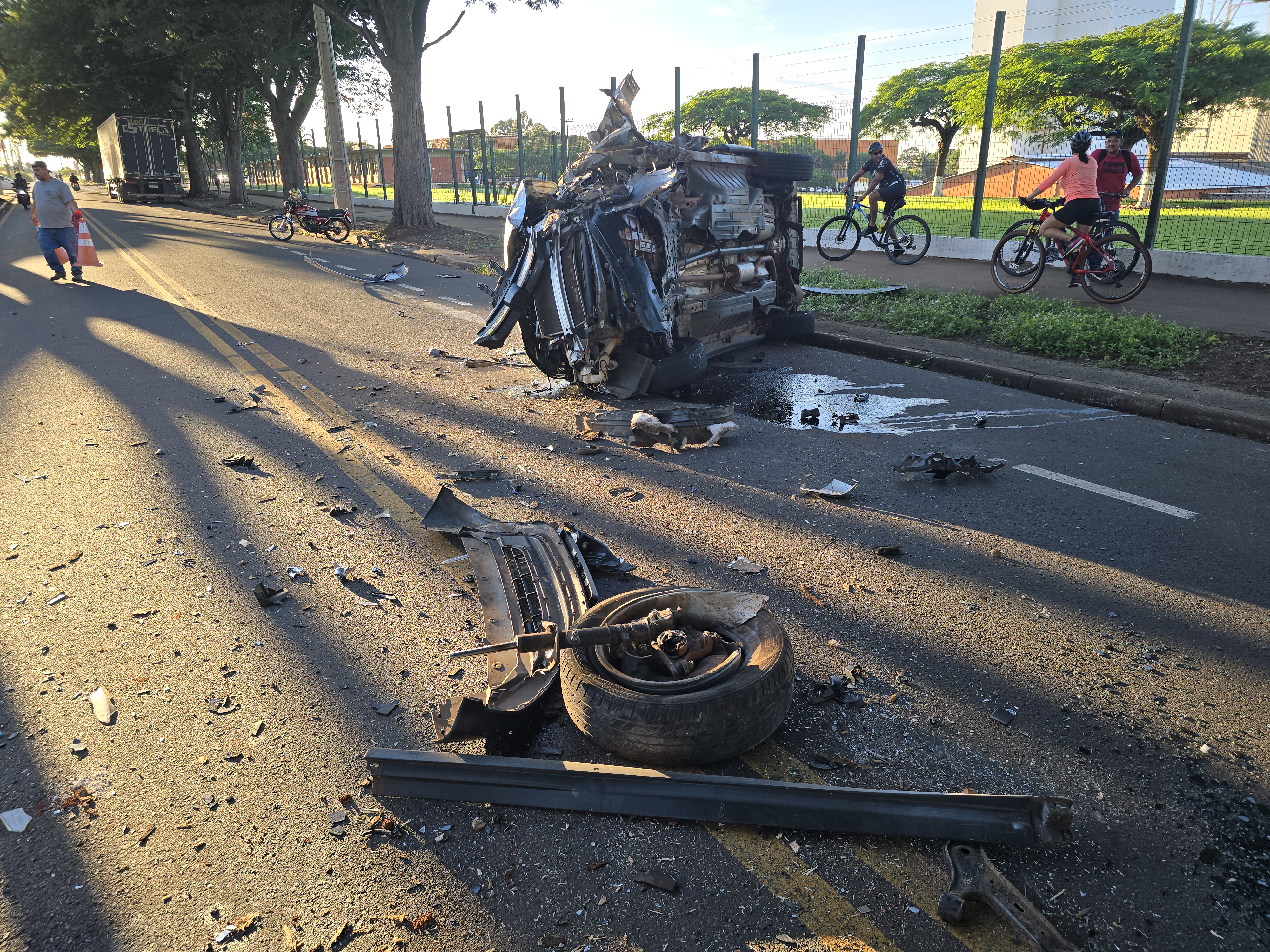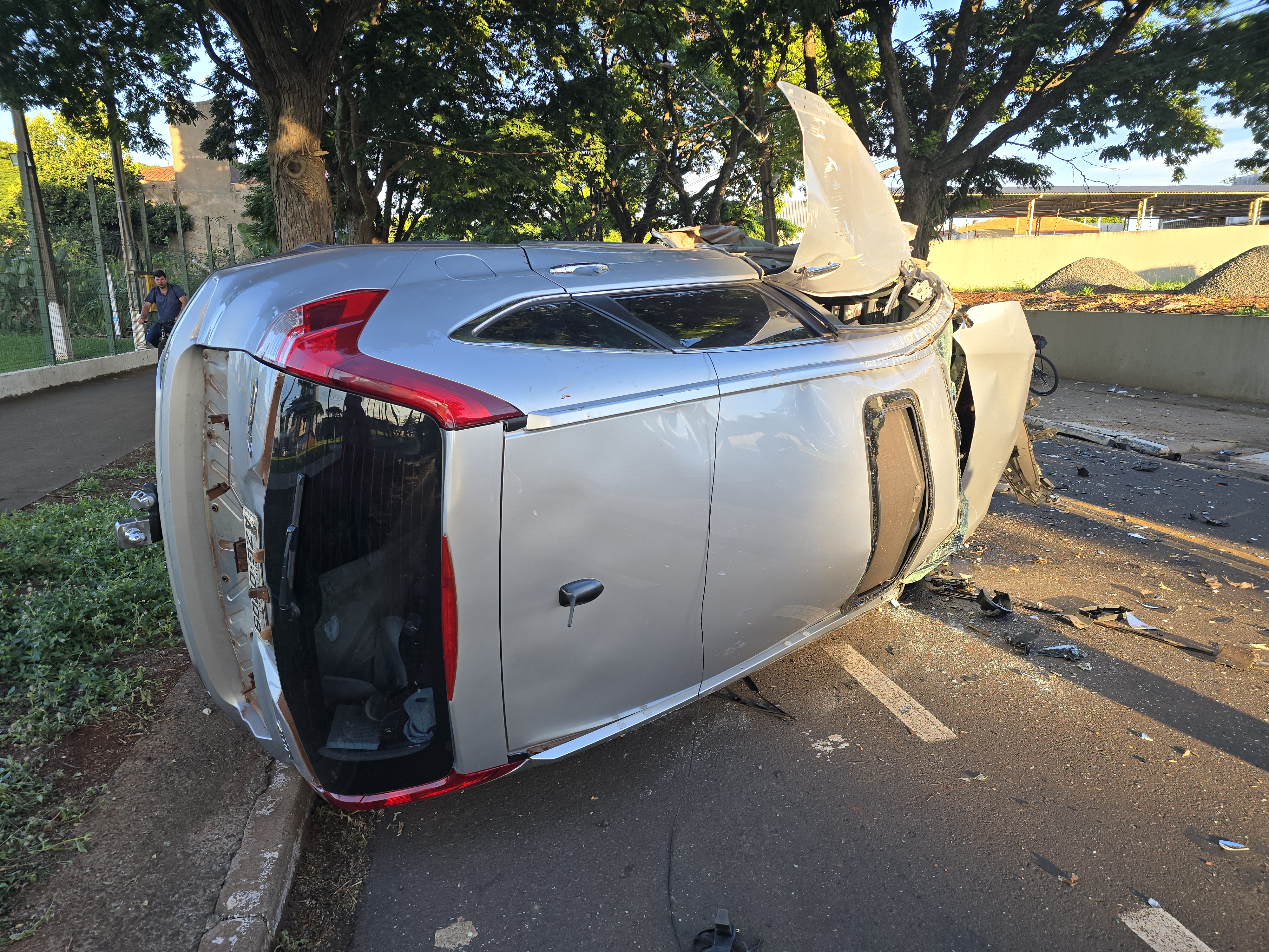 Na madrugada desta quarta-feira, 18, um Honda CR-V capotou na Rua Mitsuzo Tagushi, no bairro Vila Nova, em Maringá. O carro colidiu primeiro contra um poste e, em seguida, bateu em uma árvore. O automóvel capotou por várias vezes.