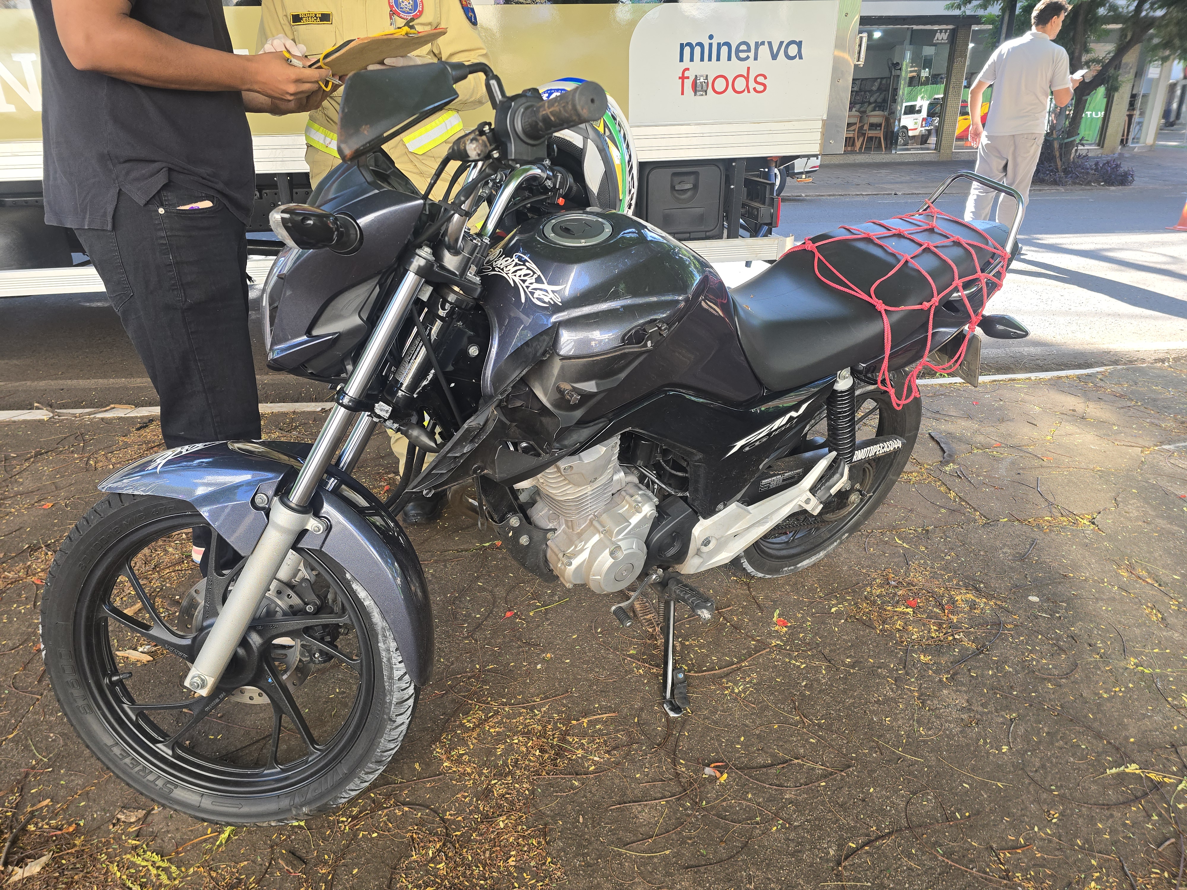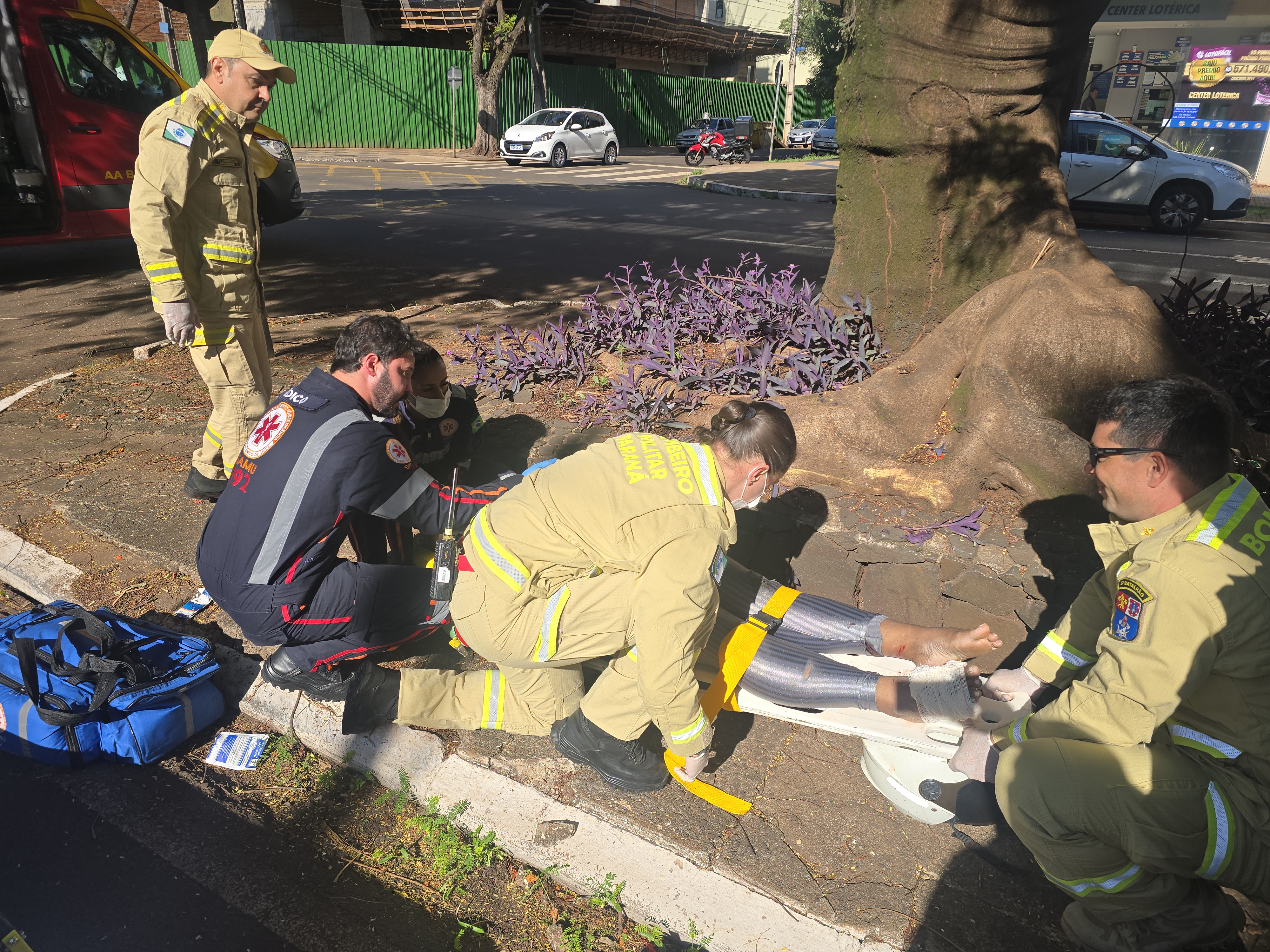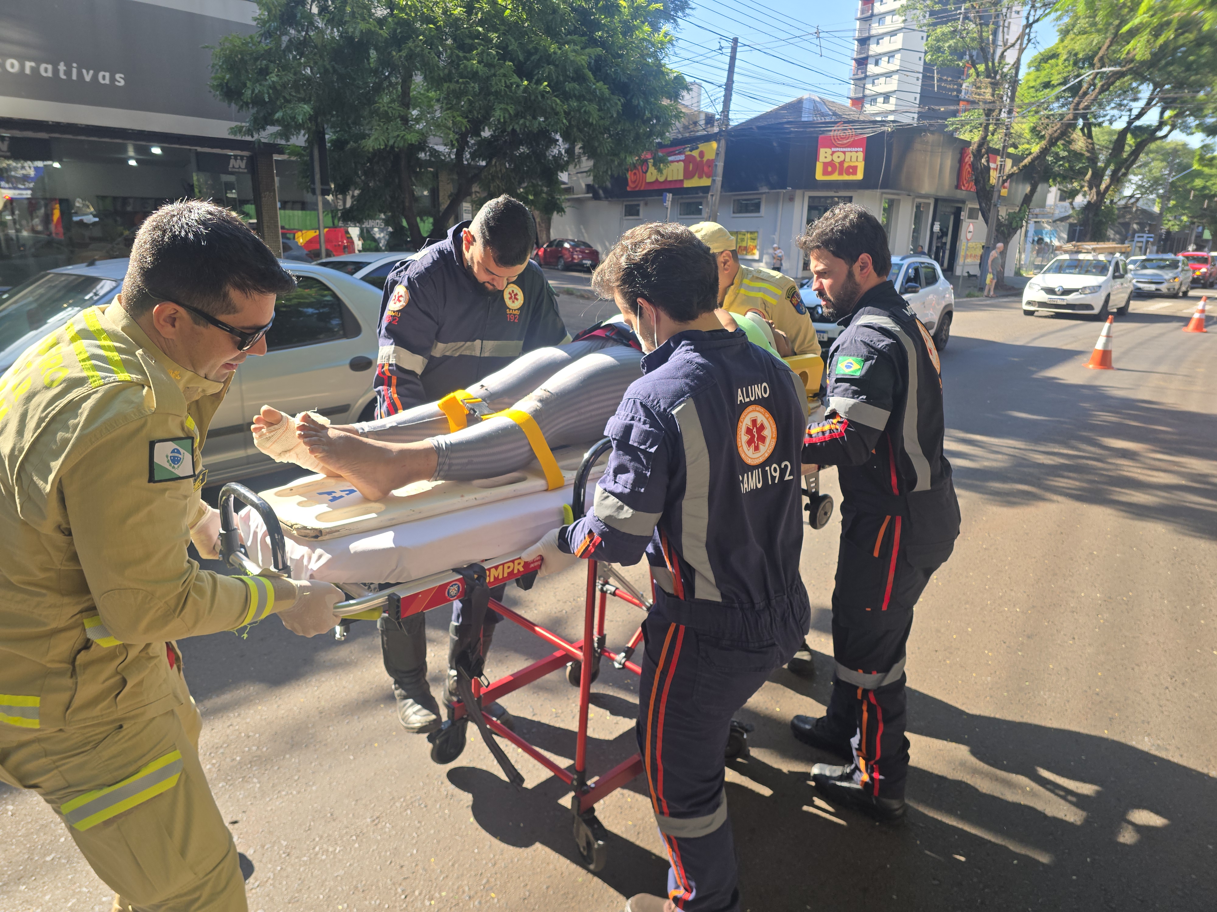 A garupa ao cair da moto sofreu uma laceração em um dos dedos do pé. Uma equipe do Siate e médica do Samu deslocaram ao local e prestaram os atendimentos. O médico Nasser Auada ao avaliar o estado de saúde da vítima constatou um trauma na coluna da paciente.