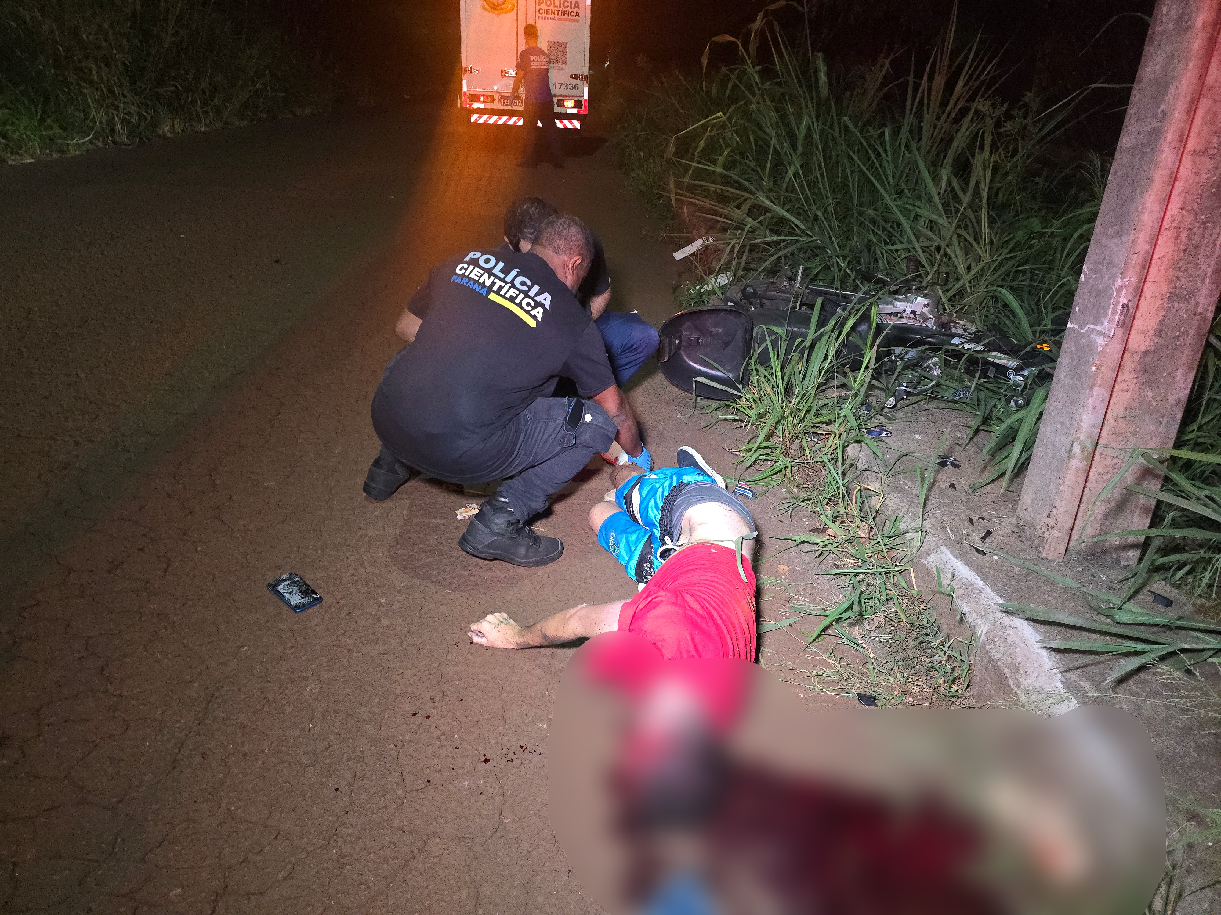 A Polícia Militar não localizou documentos que pudessem comprovar sua identidade. O corpo foi periciado e encaminhado ao Instituto Médico Legal de Maringá. A motoneta foi apreendida pela Polícia Militar. A Delegacia de Trânsito deverá solicitar imagens de câmeras para apurar as causas do acidente.