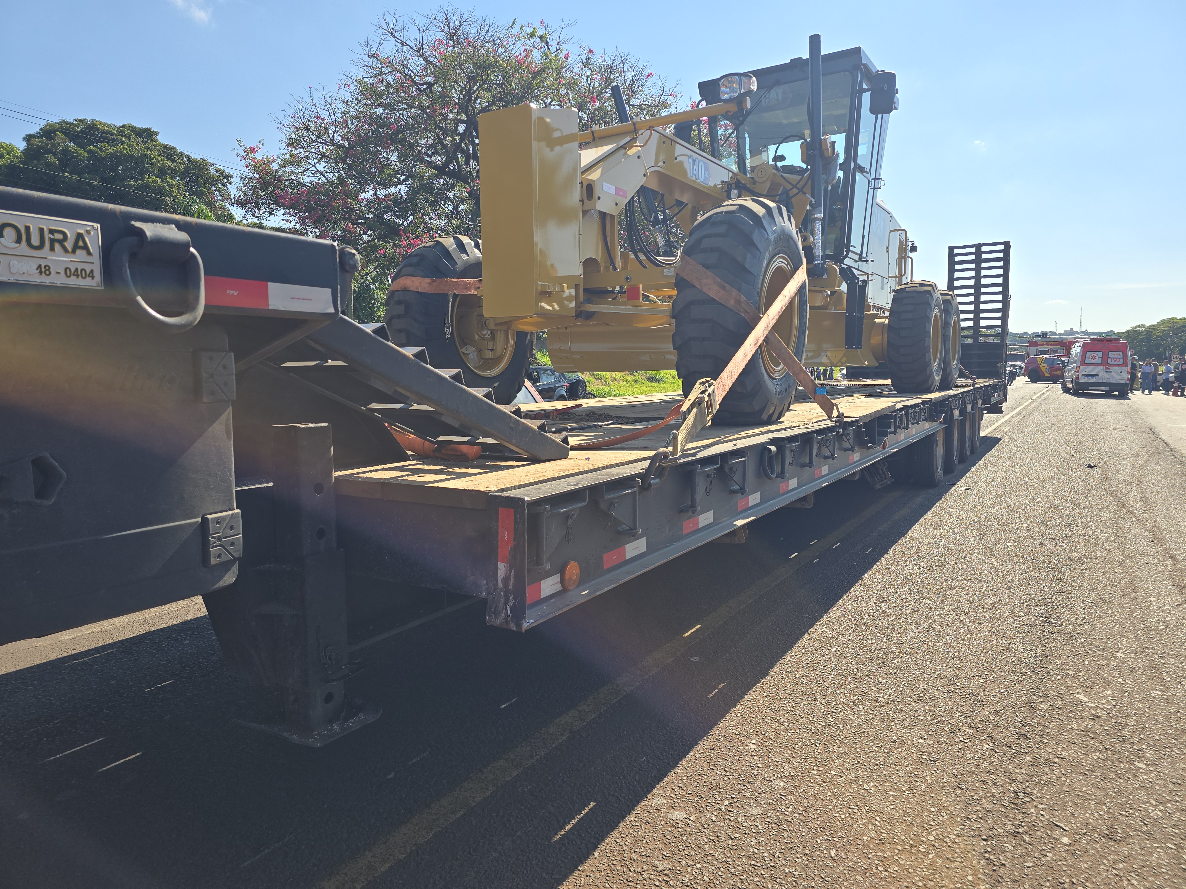 O acidente ocorreu na manhã desta segunda-feira, 6, no Contorno Sul, nas proximidades do Jardim Bertioga. Uma VW Saveiro seguia pelo Contorno Sul no sentido a Sarandi quando colidiu violentamente na lateral de um caminhão prancha que trafegava no sentido contrário e transportava um maquinário agrícola.