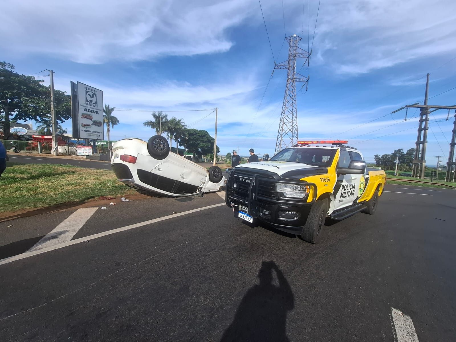 Uma colisão terminou com um veículo capotado na tarde do último sábado, 11, na rodovia PR-317, em Maringá. O acidente ocorreu no momento em que um automóvel GWM Haval trafegava pela rodovia e, ao iniciar o contorno de uma rotatória, acabou sendo atingido lateralmente por uma VW Spacefox.